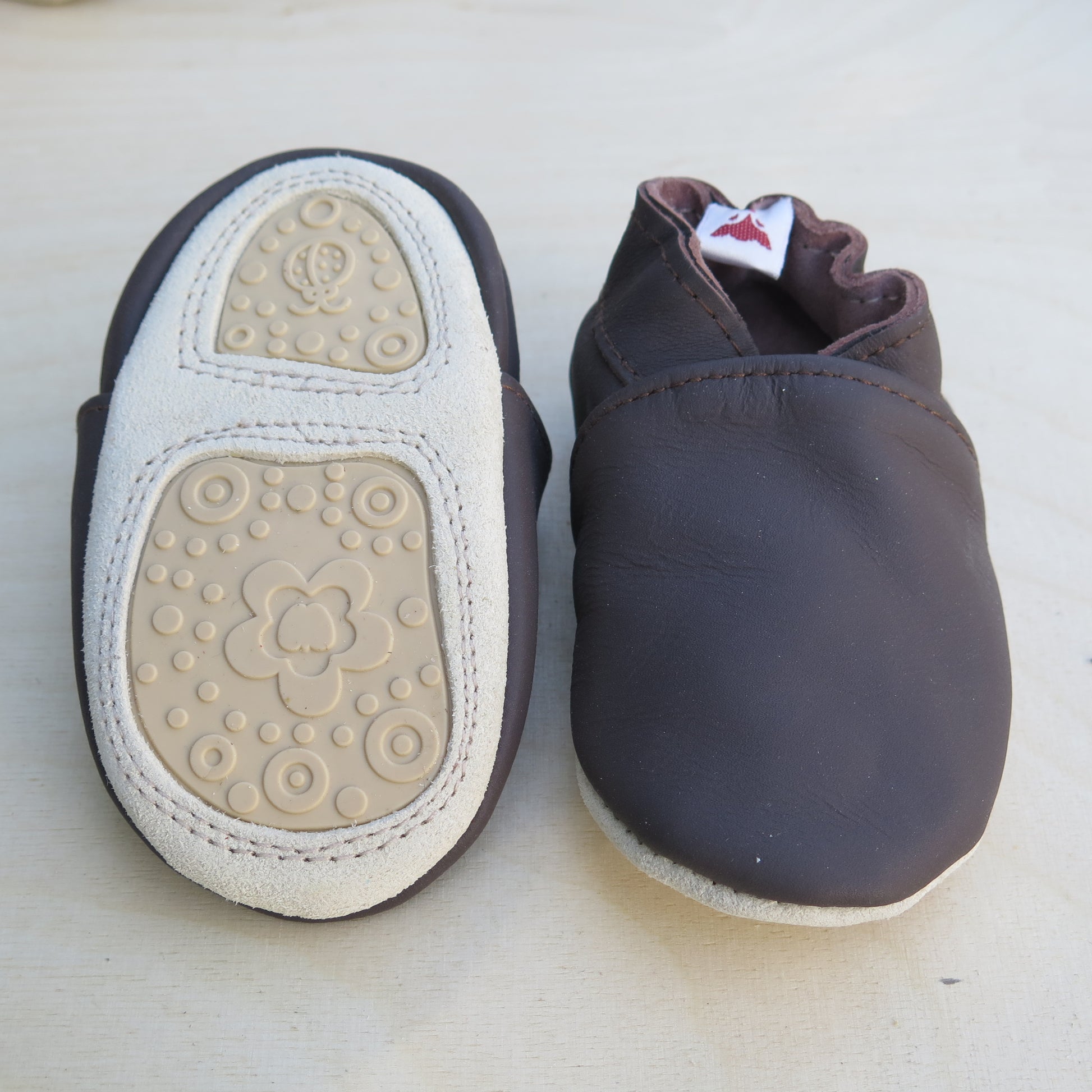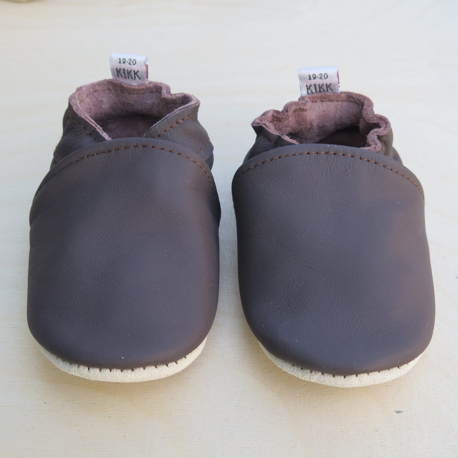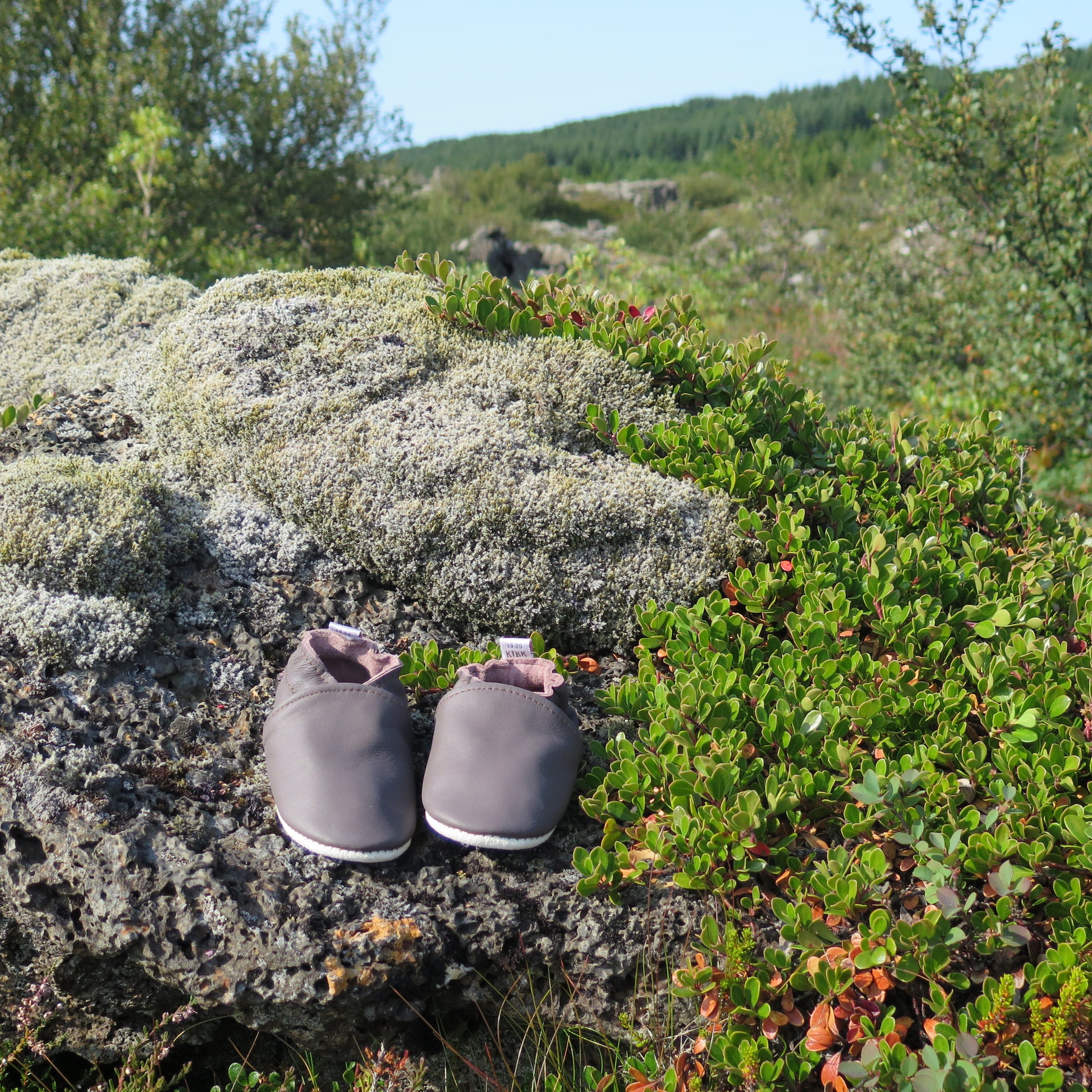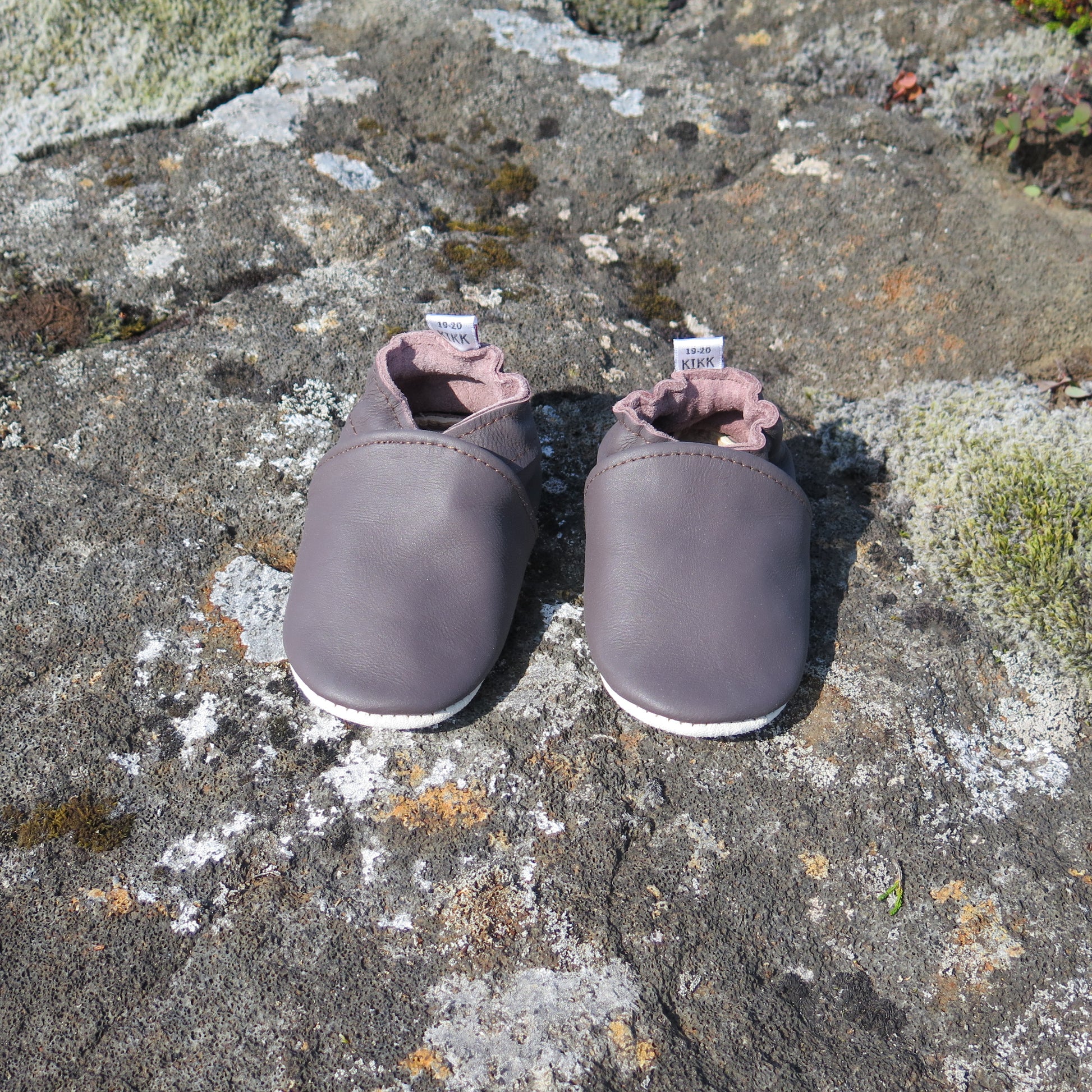 Leðurskór með gúmmí sóla. 6-12 mánaða – stærð 17-18 – 11,5 cm 9-18 mánaða – stærð 19-20 – 12,5 cm 1-2 ára – stærð 21-22 – 13,5 cm 1,5-3 ára – stærð 23-24 – 14,5 cm 2,5-4 ára – stærð 25-26 – 16,5 cm KIKK Reykjavík ungbarnaskórninr eru framleiddir úr mjúku geitaleðri. Þeir haldast vel á fæti og sólinn er stamur. Best er að hreinsa skóna með því að væta sólann og bursta rússkinnið varlega. Skóna má þrífa með blautri tusku.