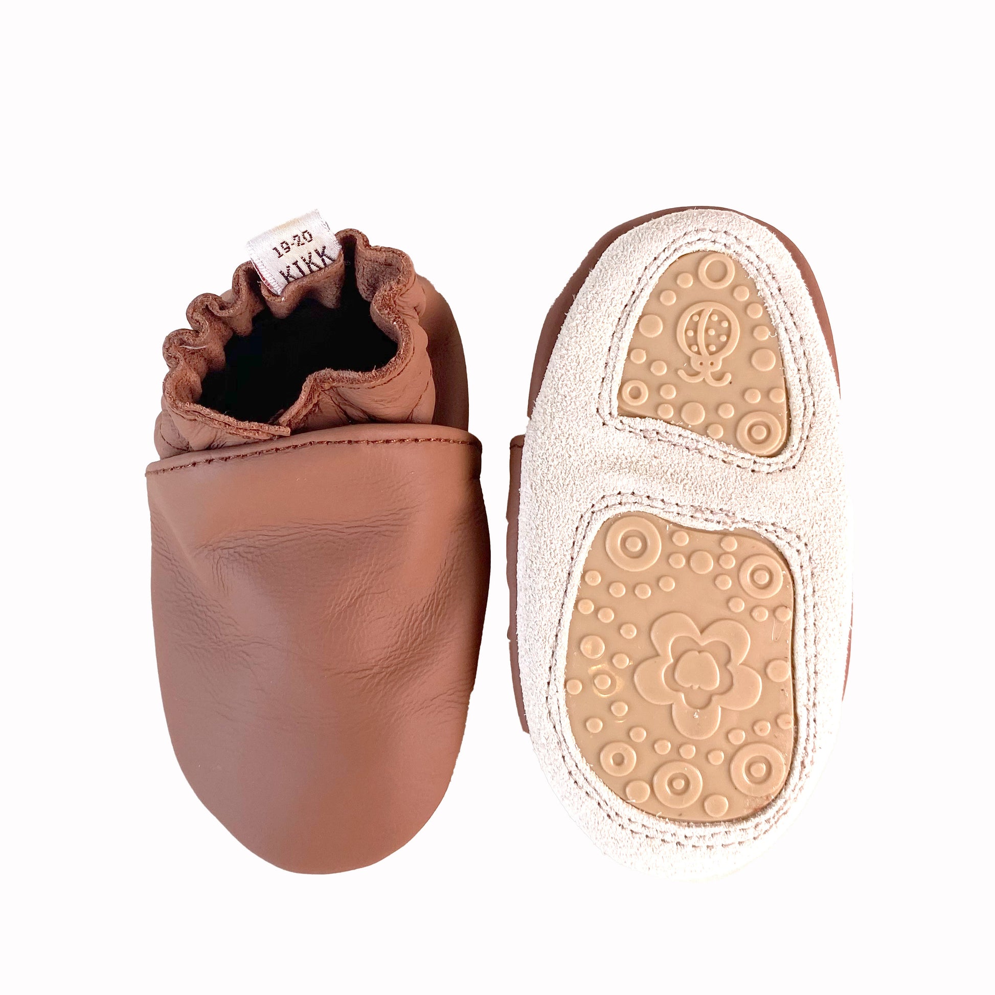 Leðurskór með gúmmí sóla. 6-12 mánaða – stærð 17-18 – 11,5 cm 9-18 mánaða – stærð 19-20 – 12,5 cm 1-2 ára – stærð 21-22 – 13,5 cm 1,5-3 ára – stærð 23-24 – 14,5 cm 2,5-4 ára – stærð 25-26 – 16,5 cm KIKK Reykjavík ungbarnaskórninr eru framleiddir úr mjúku geitaleðri. Þeir haldast vel á fæti og sólinn er stamur. Best er að hreinsa skóna með því að væta sólann og bursta rússkinnið varlega. Skóna má þrífa með blautri tusku.