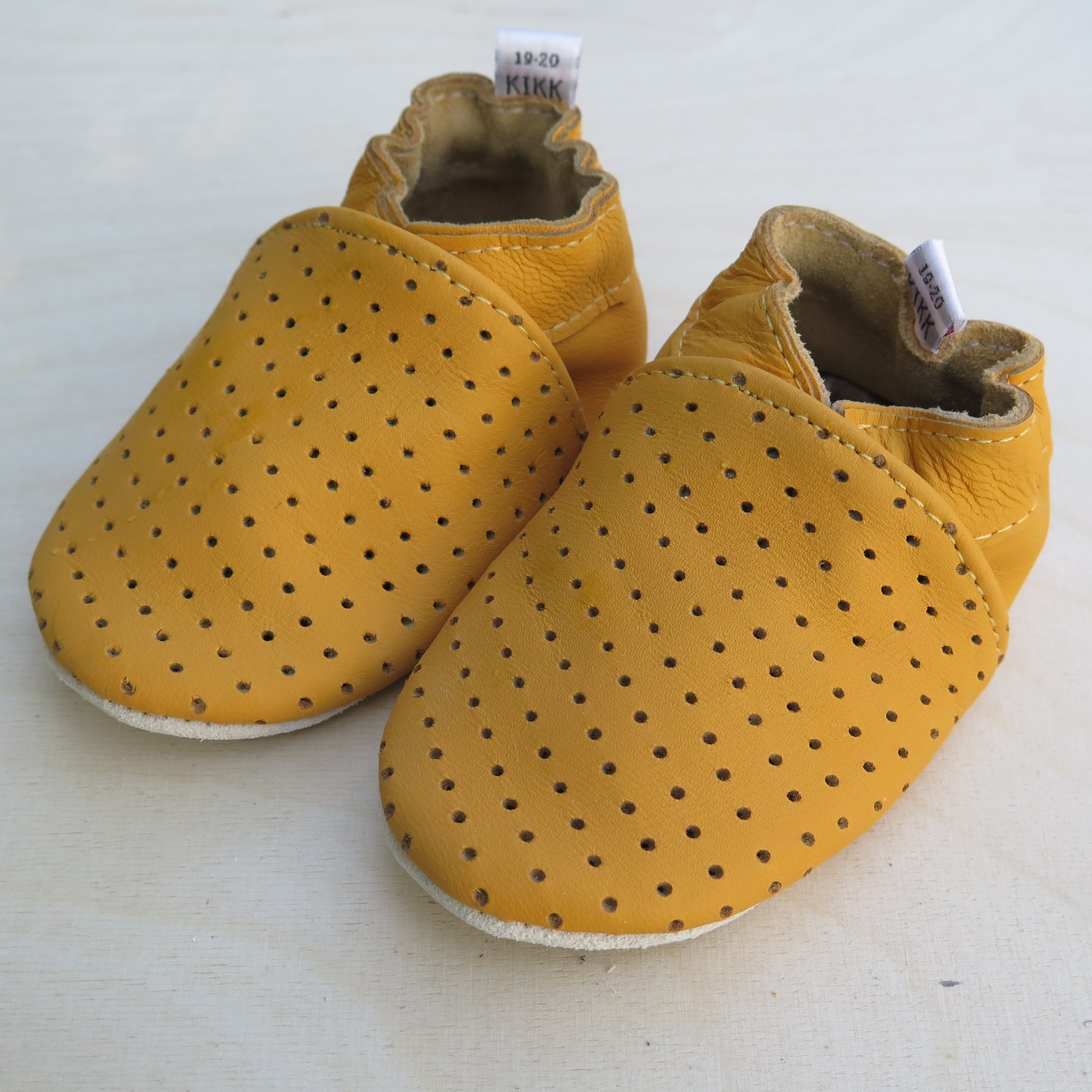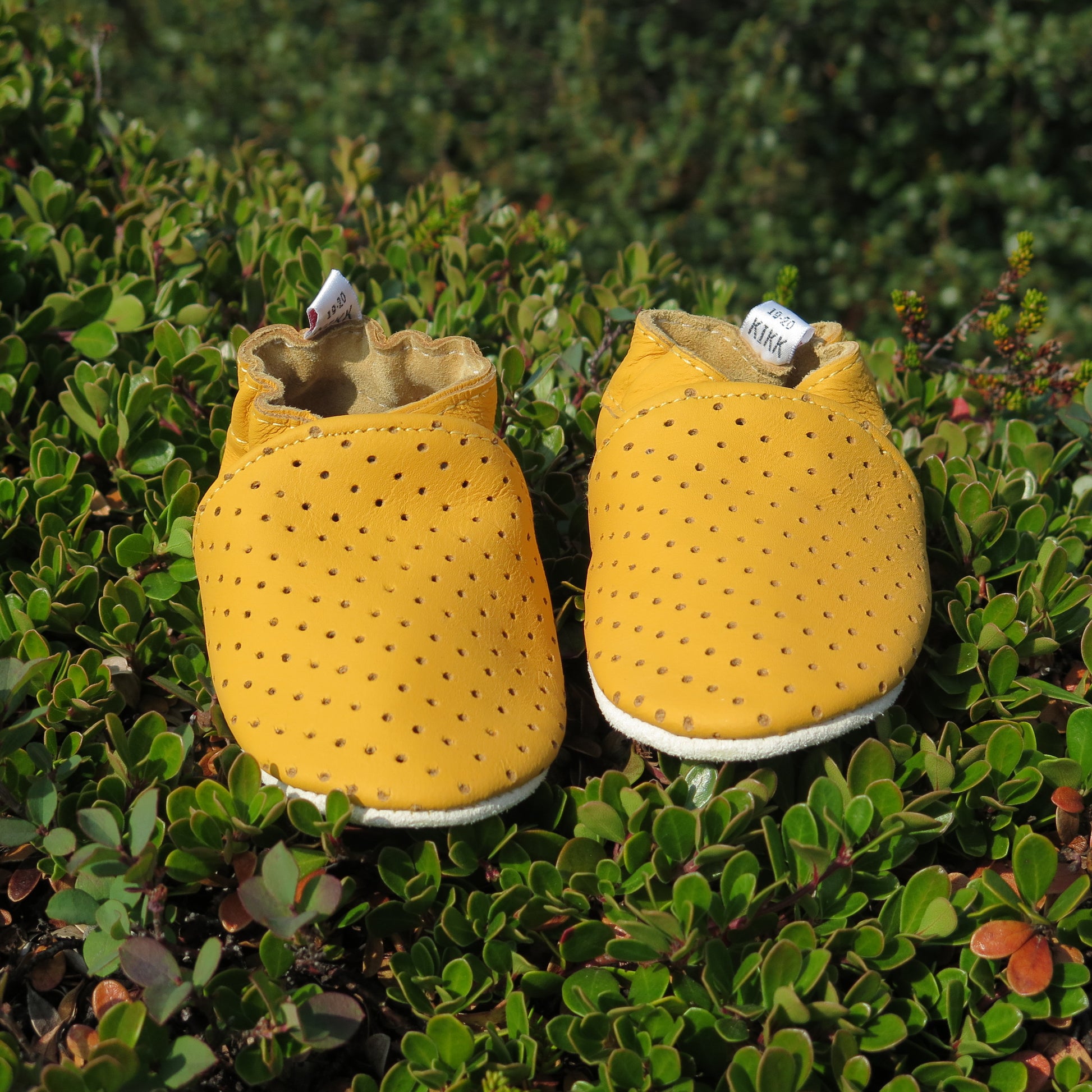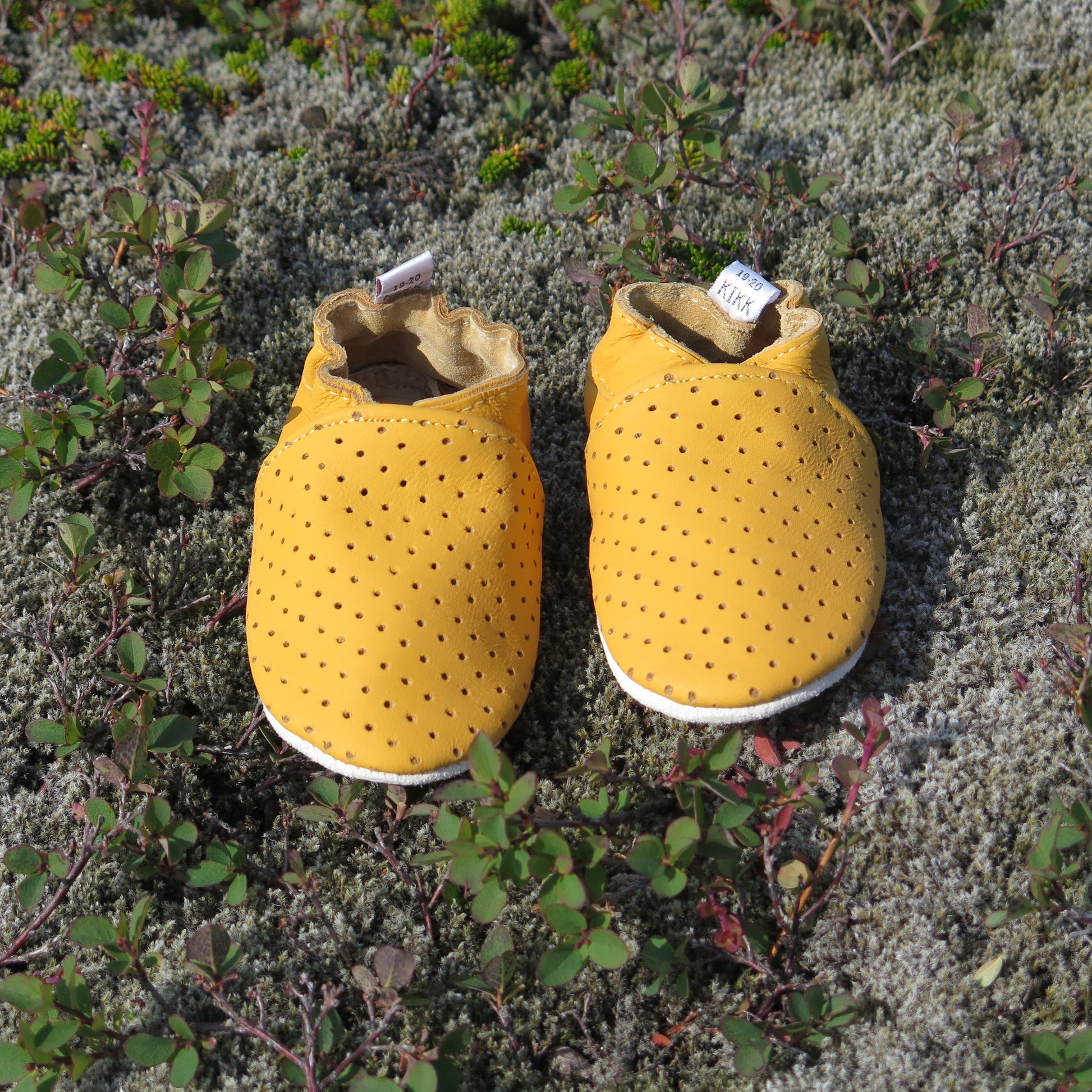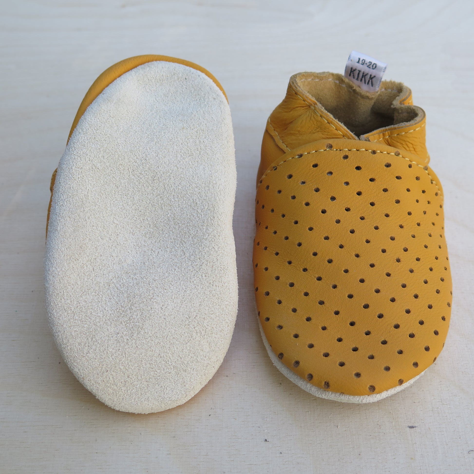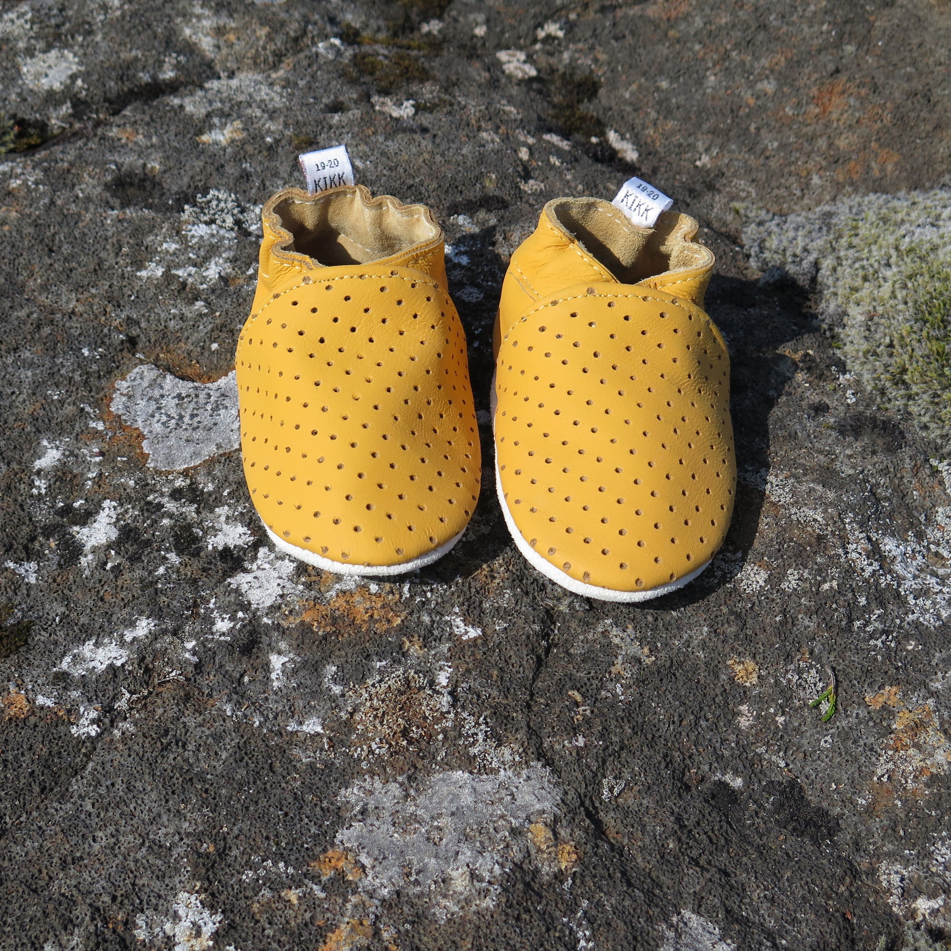 Leðurskór með mjúkum sóla. 3-9 mánaða – stærð 15-16 – 10,5 cm 6-12 mánaða – stærð 17-18 – 11,5 cm 9-18 mánaða – stærð 19-20 – 12,5 cm 1-2 ára – stærð 21-22 – 13,5 cm 1,5-3 ára – stærð 23-24 – 14,5 cm 2,5-4 ára – stærð 25-26 – 16,5 cm KIKK Reykjavík ungbarnaskórninr eru framleiddir úr mjúku geitaleðri. Þeir haldast vel á fæti og sólinn er stamur. Best er að hreinsa skóna með því að væta sólann og bursta rússkinnið varlega. Skóna má þrífa með blautri tusku.