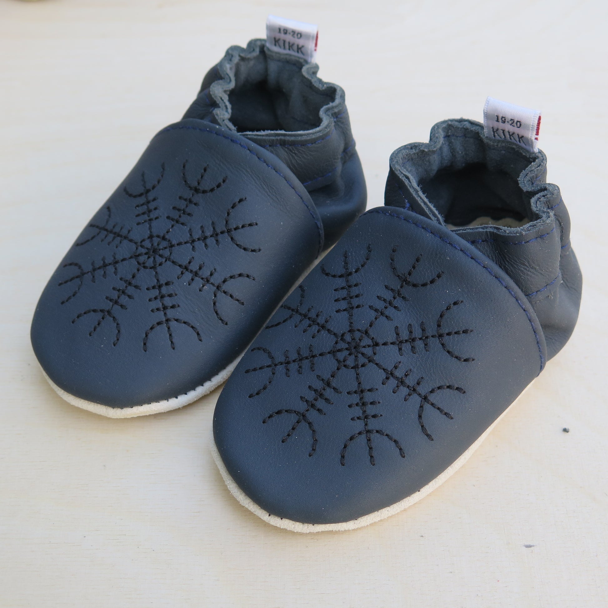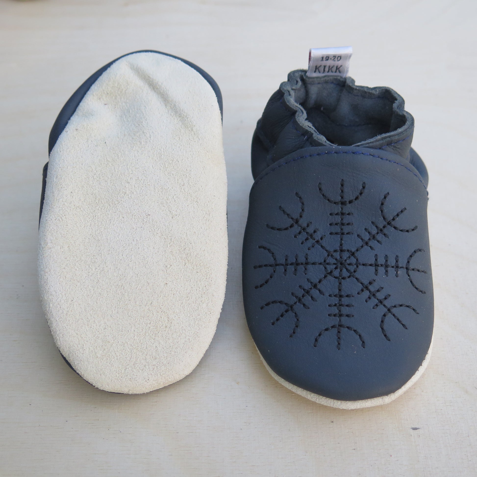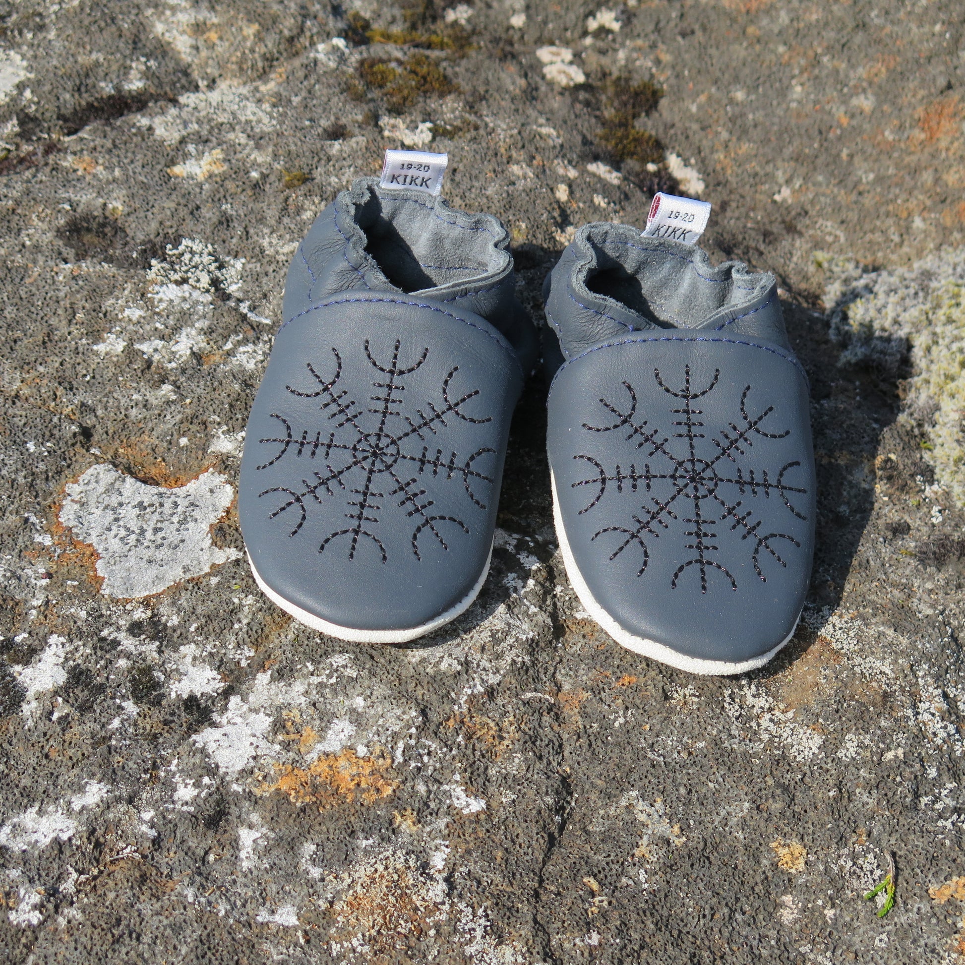 Leðurskór með mjúkum sóla. 3-9 mánaða – stærð 15-16 – 10,5 cm 6-12 mánaða – stærð 17-18 – 11,5 cm 9-18 mánaða – stærð 19-20 – 12,5 cm 1-2 ára – stærð 21-22 – 13,5 cm 1,5-3 ára – stærð 23-24 – 14,5 cm 2,5-4 ára – stærð 25-26 – 16,5 cm KIKK Reykjavík ungbarnaskórninr eru framleiddir úr mjúku geitaleðri. Þeir haldast vel á fæti og sólinn er stamur. Best er að hreinsa skóna með því að væta sólann og bursta rússkinnið varlega. Skóna má þrífa með blautri tusku.