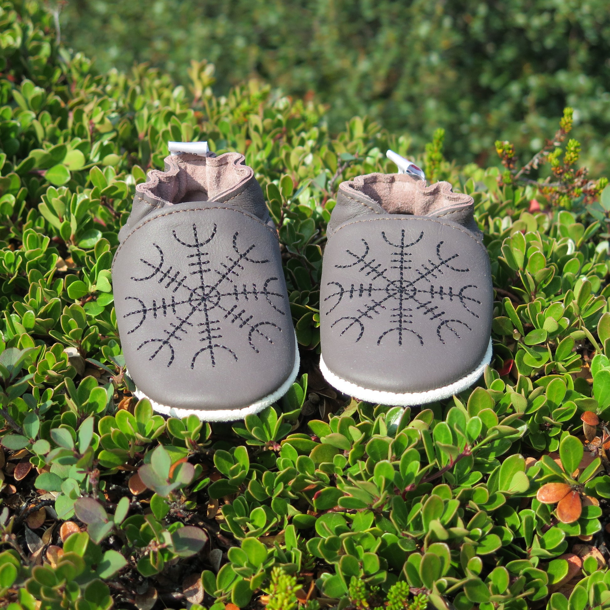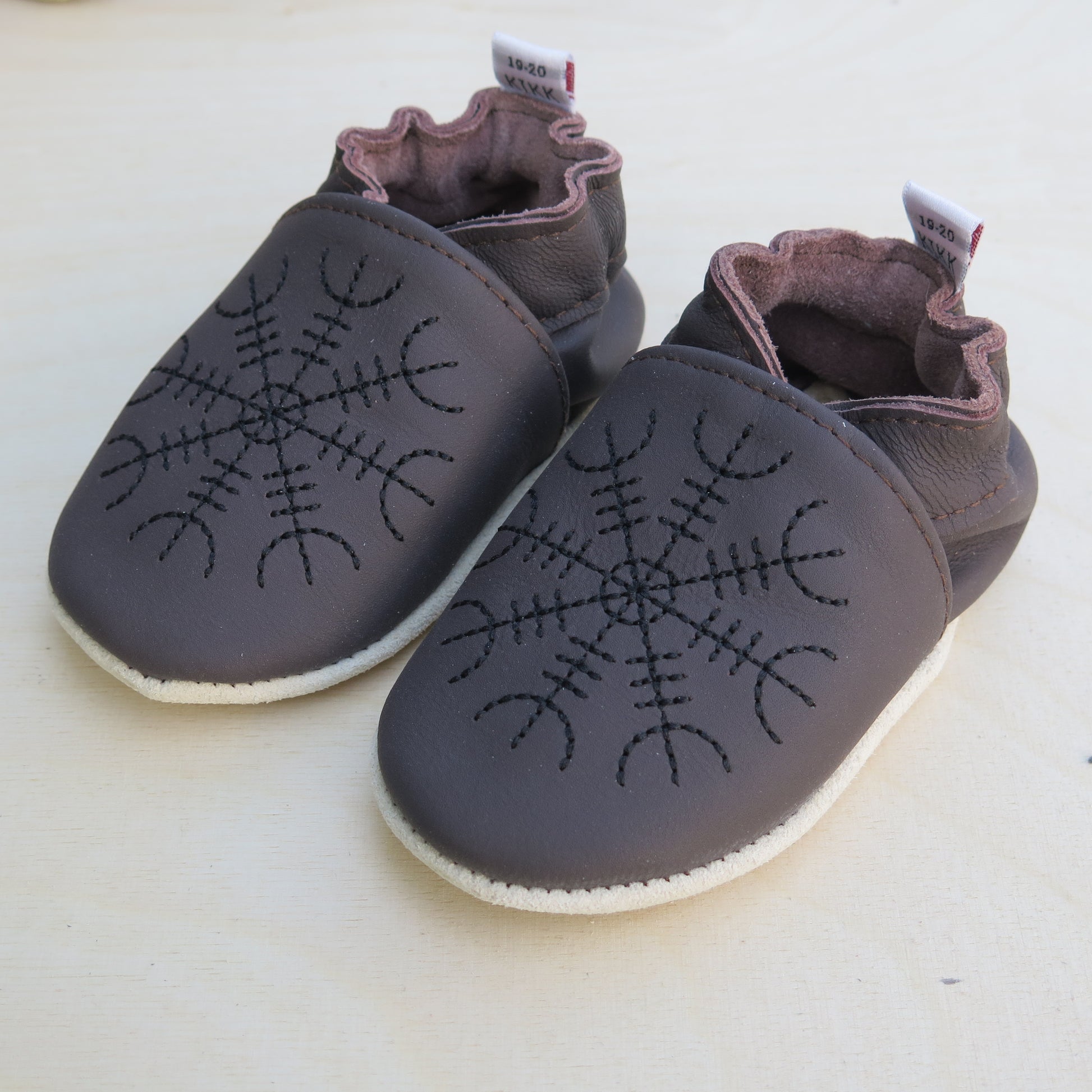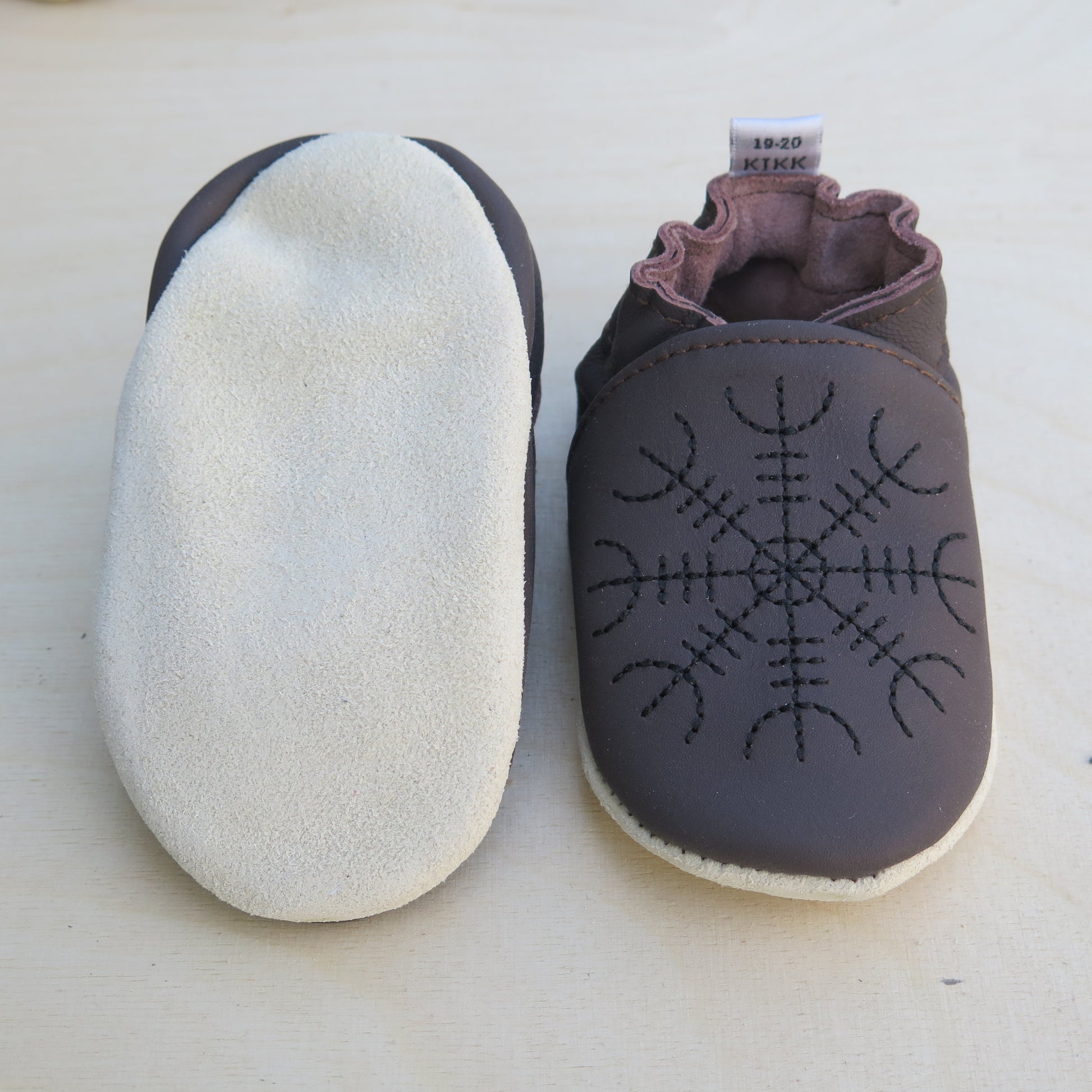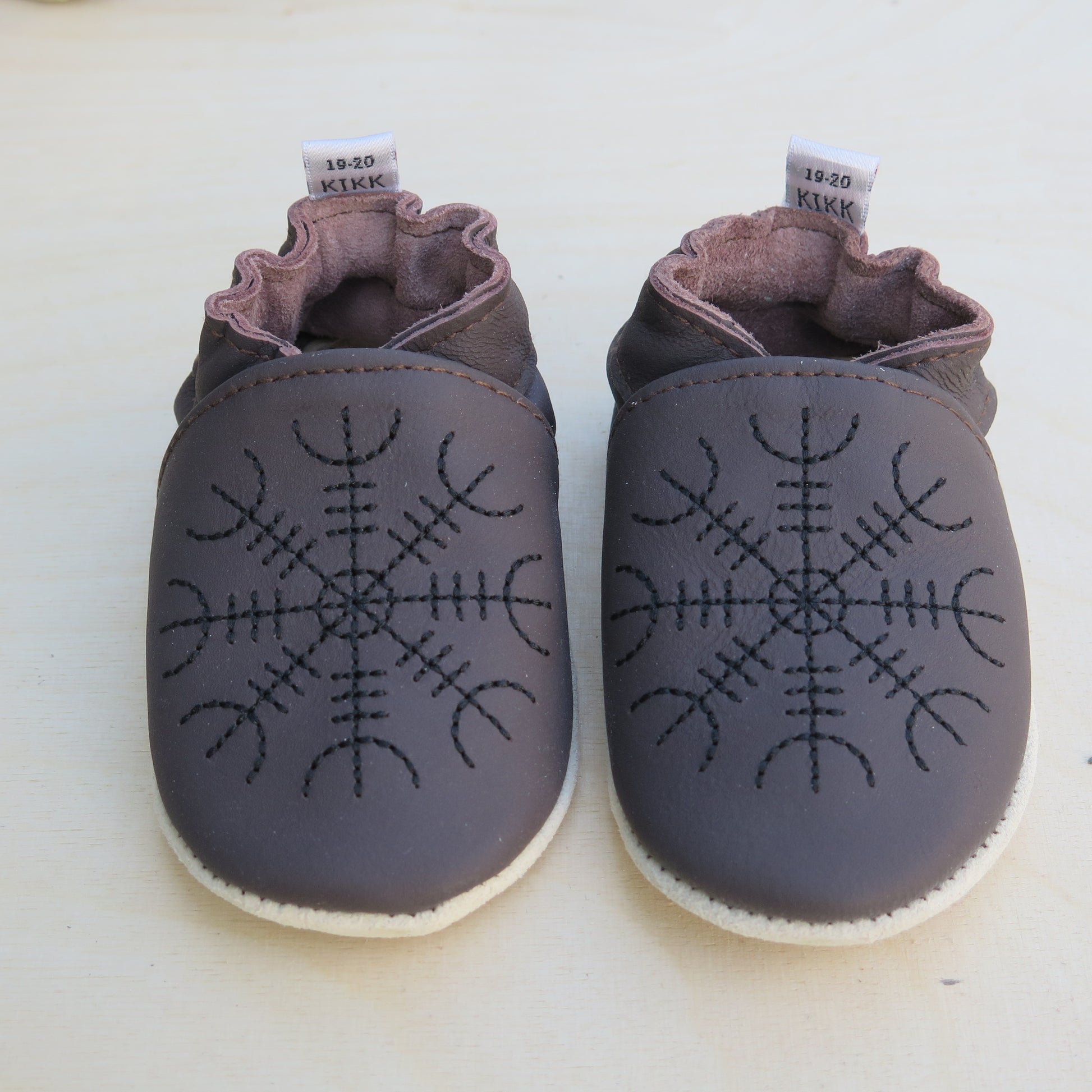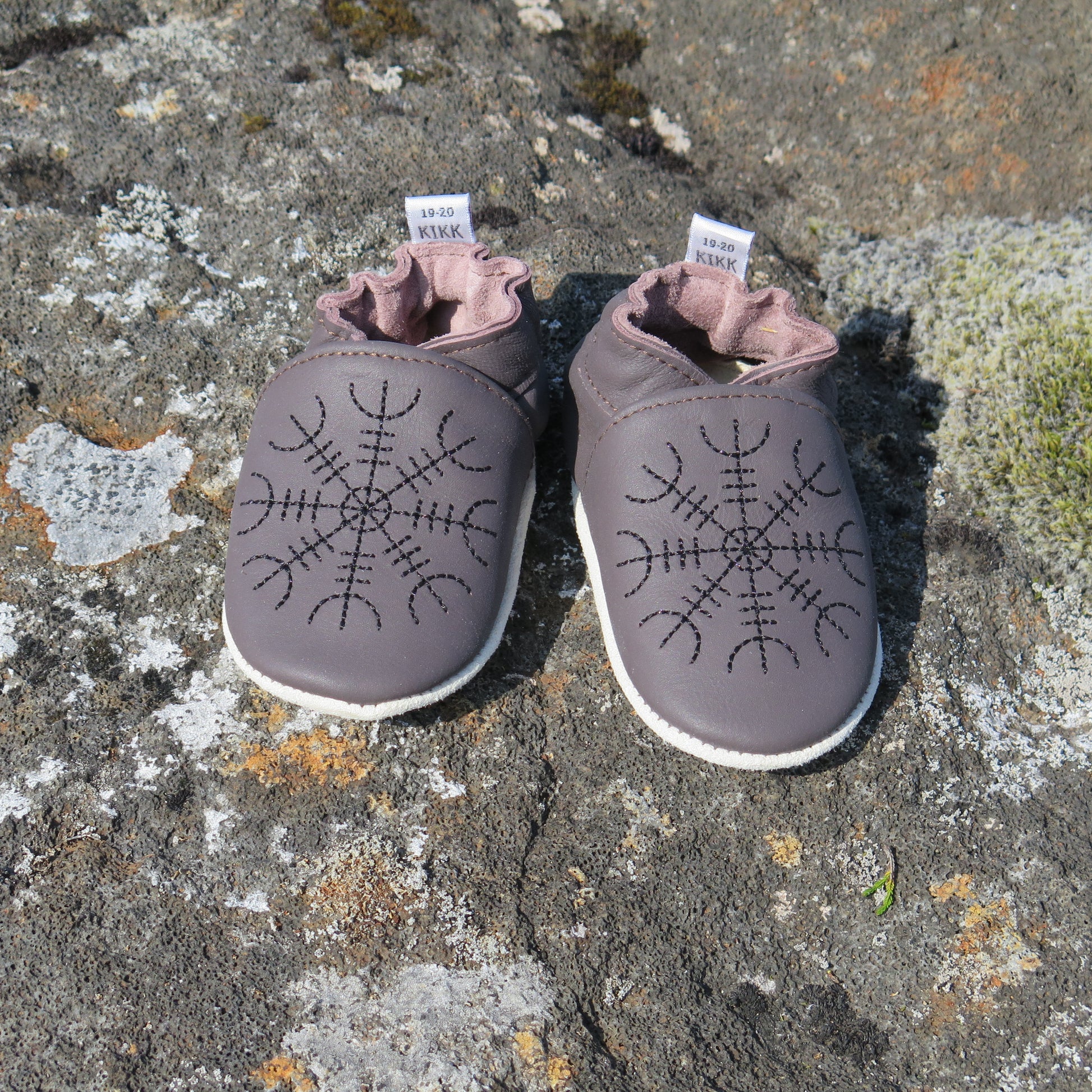 Leðurskór með mjúkum sóla. 3-9 mánaða – stærð 15-16 – 10,5 cm 6-12 mánaða – stærð 17-18 – 11,5 cm 9-18 mánaða – stærð 19-20 – 12,5 cm 1-2 ára – stærð 21-22 – 13,5 cm 1,5-3 ára – stærð 23-24 – 14,5 cm 2,5-4 ára – stærð 25-26 – 16,5 cm KIKK Reykjavík ungbarnaskórninr eru framleiddir úr mjúku geitaleðri. Þeir haldast vel á fæti og sólinn er stamur. Best er að hreinsa skóna með því að væta sólann og bursta rússkinnið varlega. Skóna má þrífa með blautri tusku.