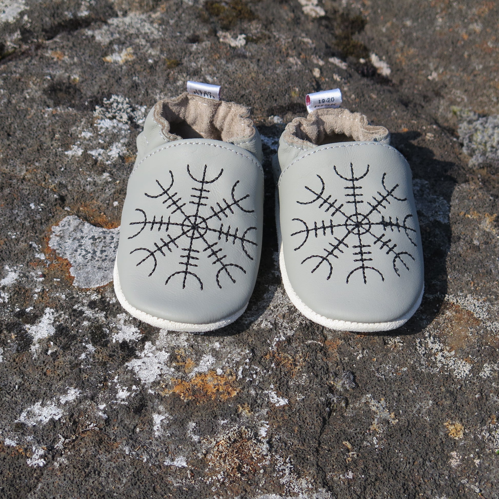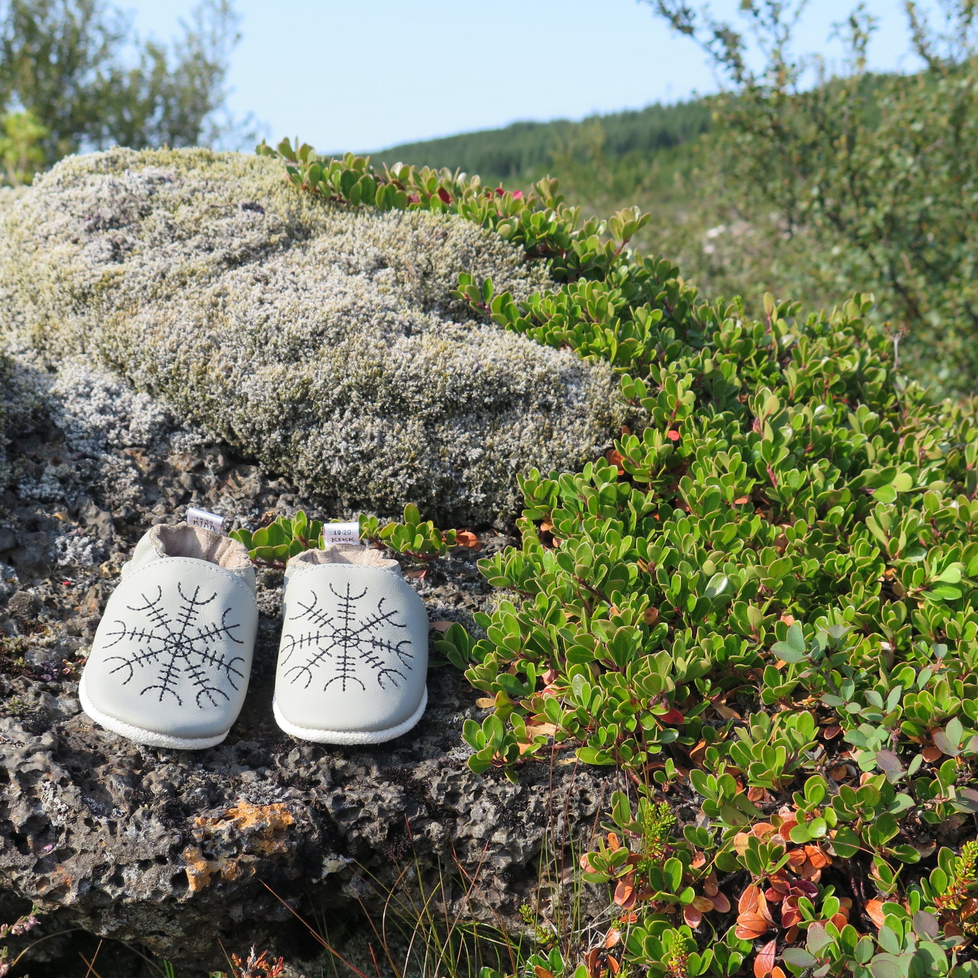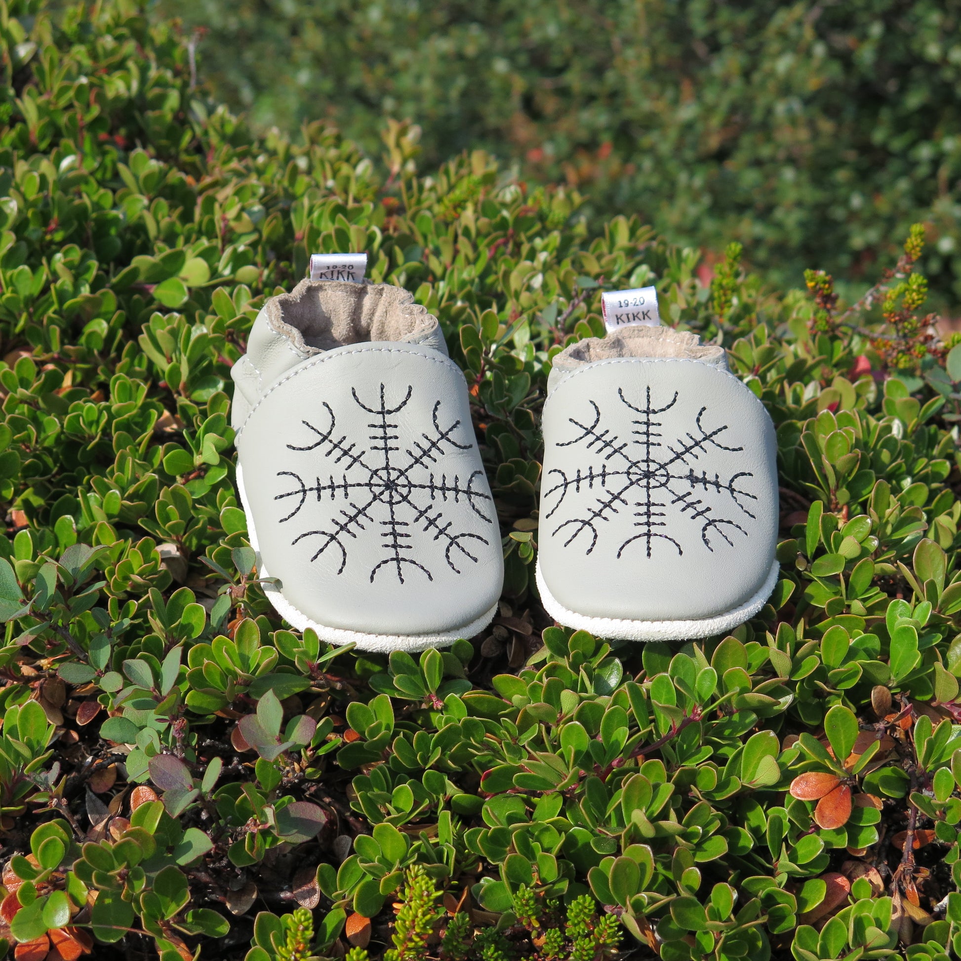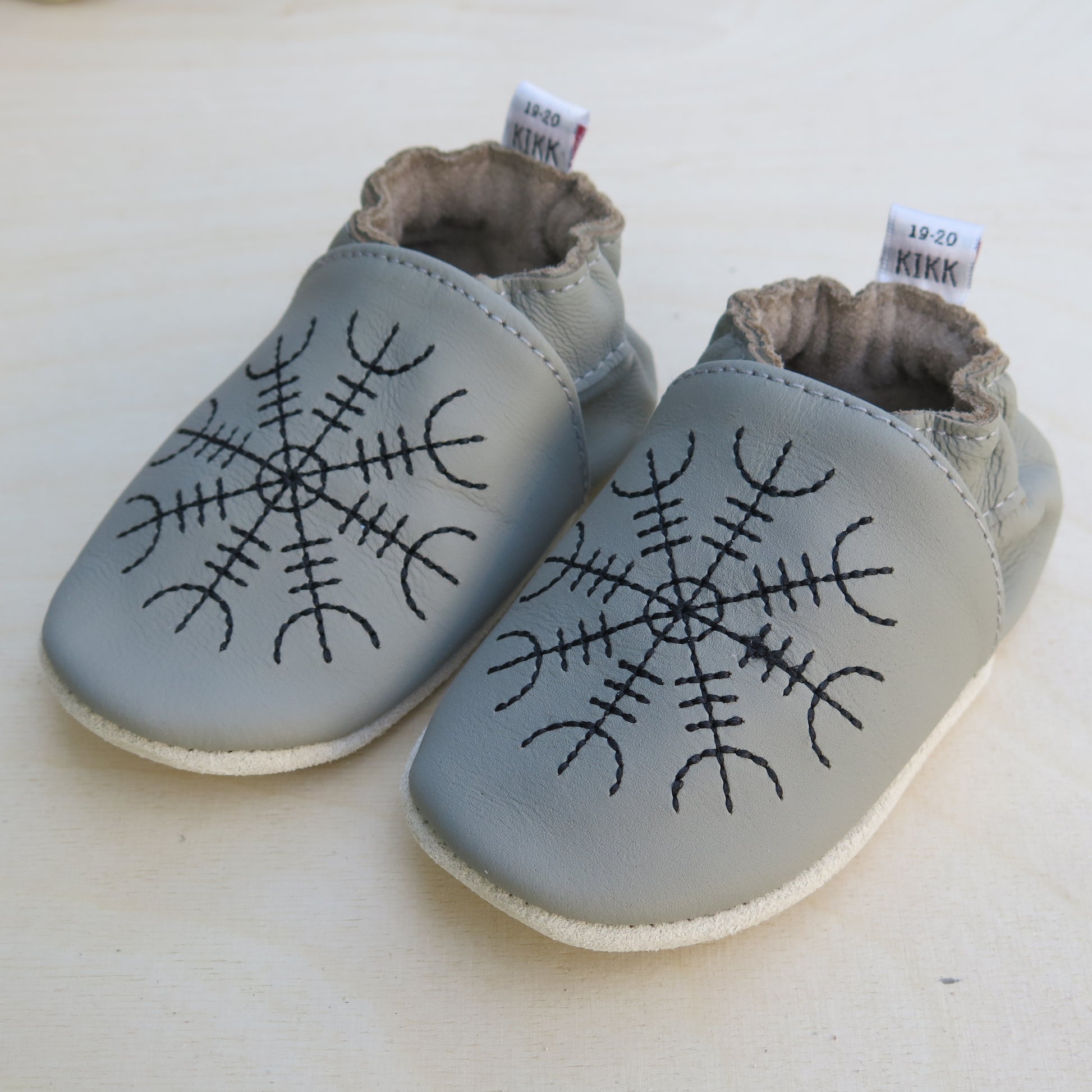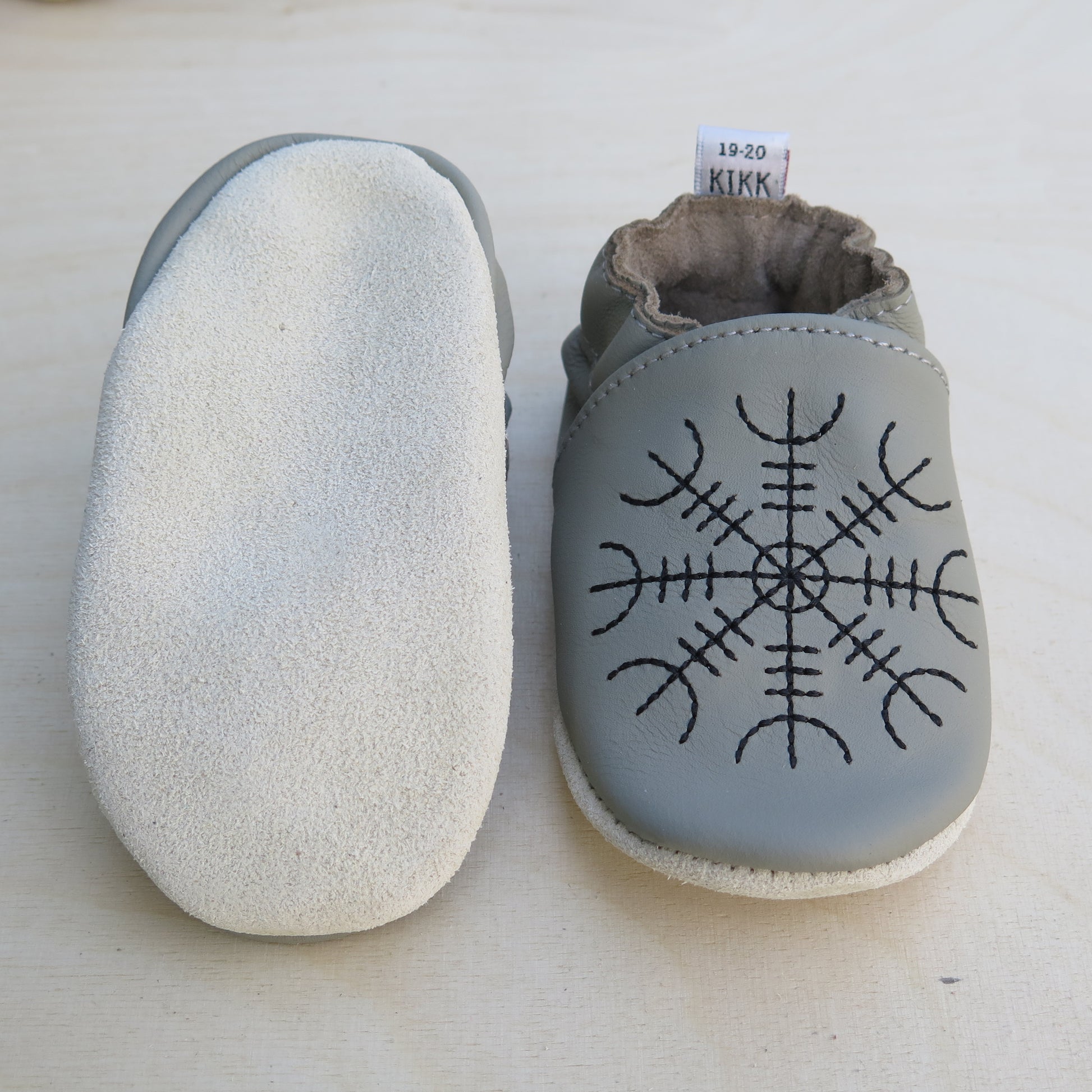 Leðurskór með mjúkum sóla. 3-9 mánaða – stærð 15-16 – 10,5 cm 6-12 mánaða – stærð 17-18 – 11,5 cm 9-18 mánaða – stærð 19-20 – 12,5 cm 1-2 ára – stærð 21-22 – 13,5 cm 1,5-3 ára – stærð 23-24 – 14,5 cm 2,5-4 ára – stærð 25-26 – 16,5 cm KIKK Reykjavík ungbarnaskórninr eru framleiddir úr mjúku geitaleðri. Þeir haldast vel á fæti og sólinn er stamur. Best er að hreinsa skóna með því að væta sólann og bursta rússkinnið varlega. Skóna má þrífa með blautri tusku.