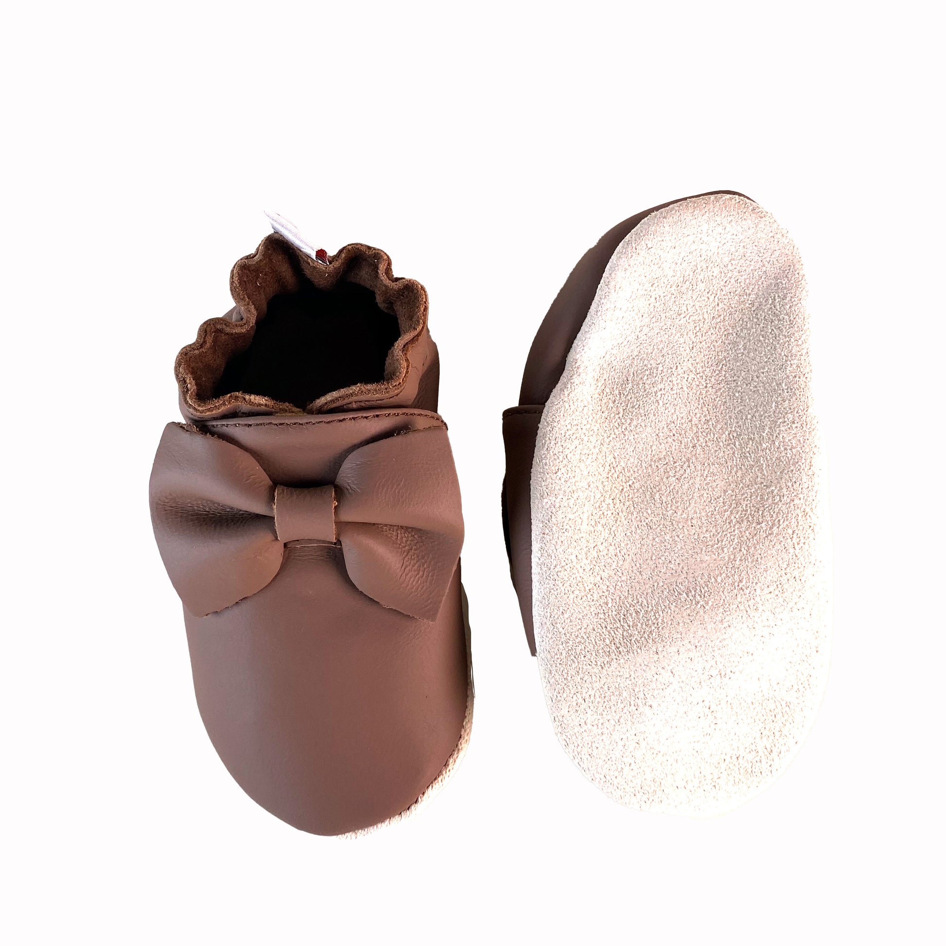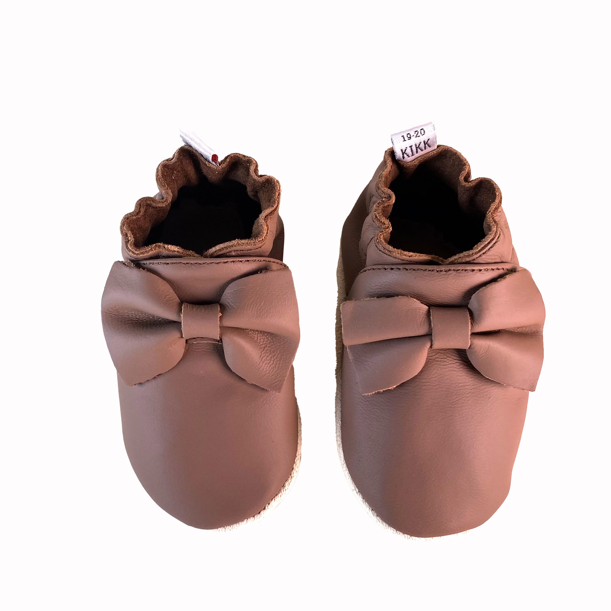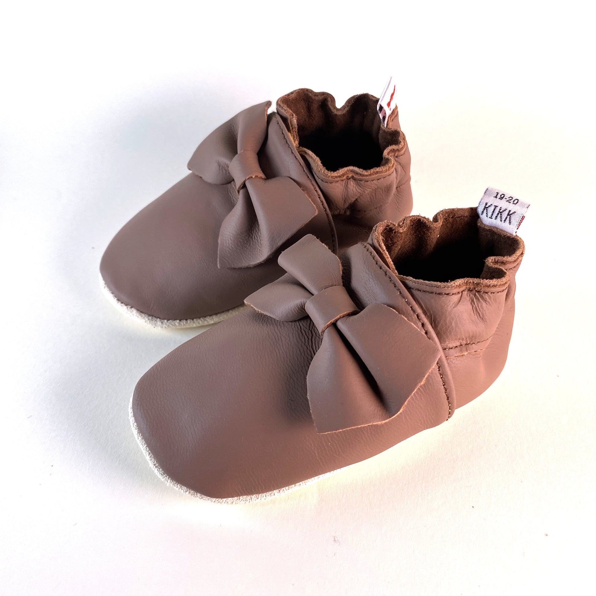 Leðurskór með mjúkum sóla. 3-9 mánaða – stærð 15-16 – 10,5 cm 6-12 mánaða – stærð 17-18 – 11,5 cm 9-18 mánaða – stærð 19-20 – 12,5 cm 1-2 ára – stærð 21-22 – 13,5 cm 1,5-3 ára – stærð 23-24 – 14,5 cm 2,5-4 ára – stærð 25-26 – 16,5 cm KIKK Reykjavík ungbarnaskórninr eru framleiddir úr mjúku geitaleðri. Þeir haldast vel á fæti og sólinn er stamur. Best er að hreinsa skóna með því að væta sólann og bursta rússkinnið varlega. Skóna má þrífa með blautri tusku.