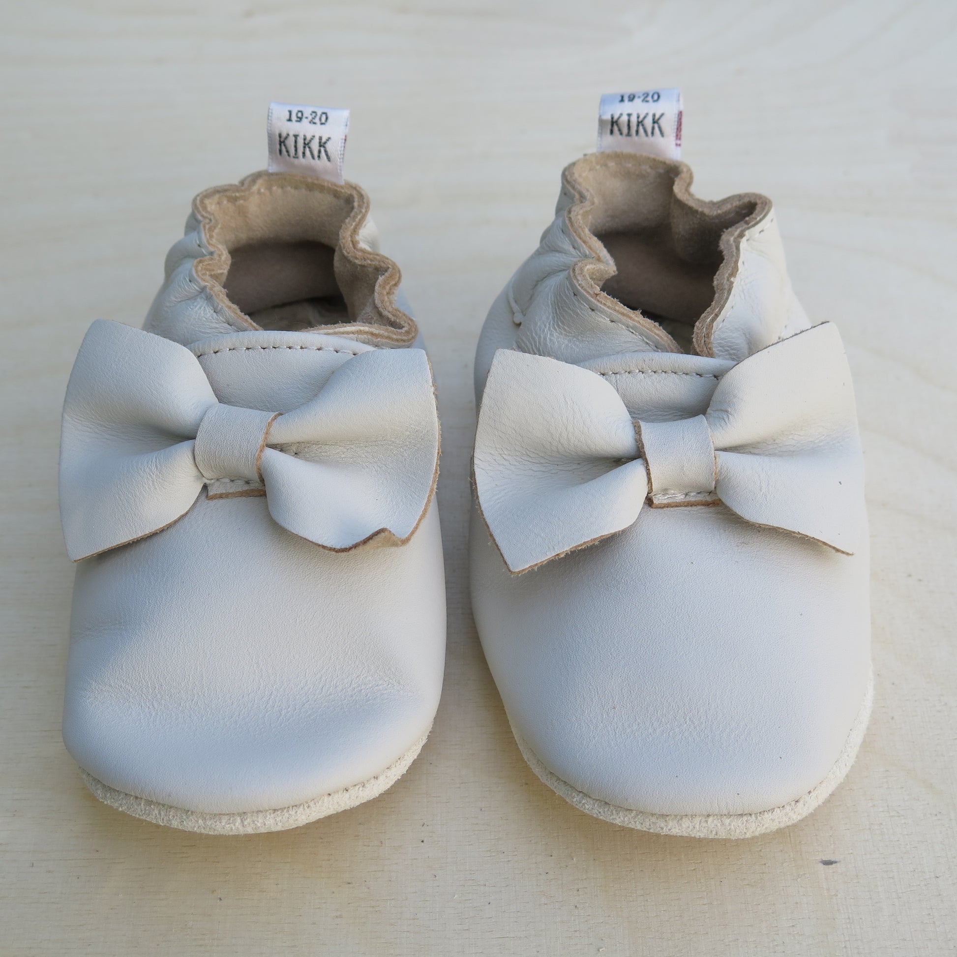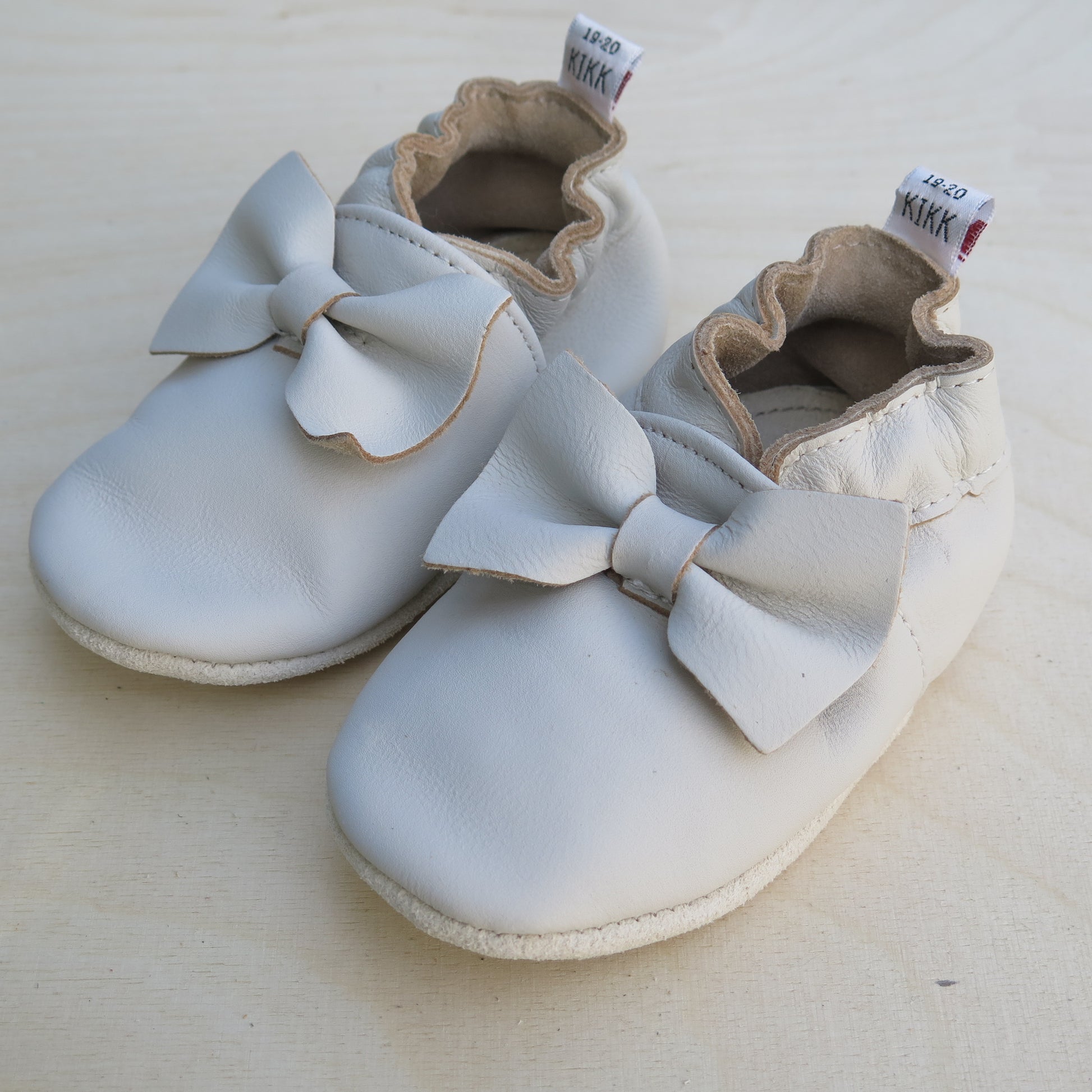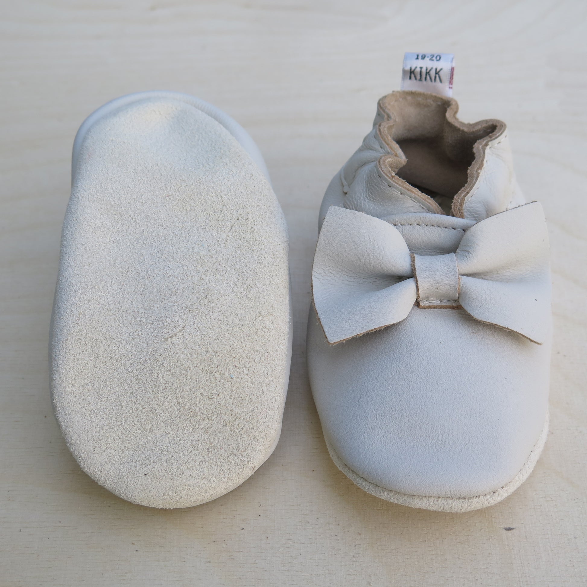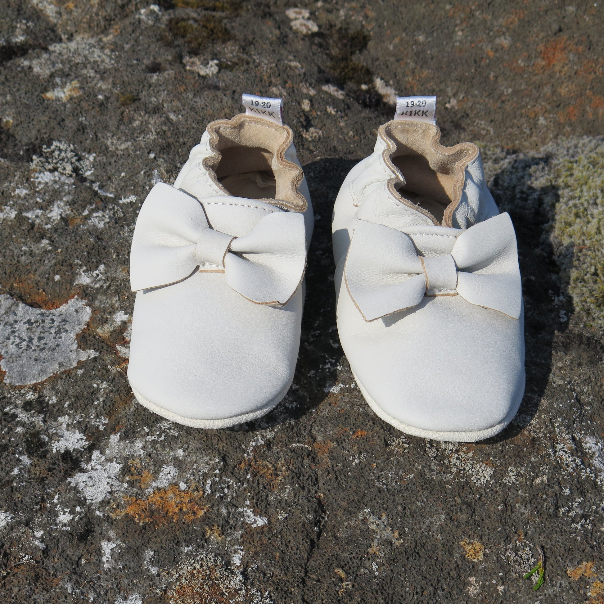 Leðurskór með mjúkum sóla. 3-9 mánaða – stærð 15-16 – 10,5 cm 6-12 mánaða – stærð 17-18 – 11,5 cm 9-18 mánaða – stærð 19-20 – 12,5 cm 1-2 ára – stærð 21-22 – 13,5 cm 1,5-3 ára – stærð 23-24 – 14,5 cm 2,5-4 ára – stærð 25-26 – 16,5 cm KIKK Reykjavík ungbarnaskórninr eru framleiddir úr mjúku geitaleðri. Þeir haldast vel á fæti og sólinn er stamur. Best er að hreinsa skóna með því að væta sólann og bursta rússkinnið varlega. Skóna má þrífa með blautri tusku.