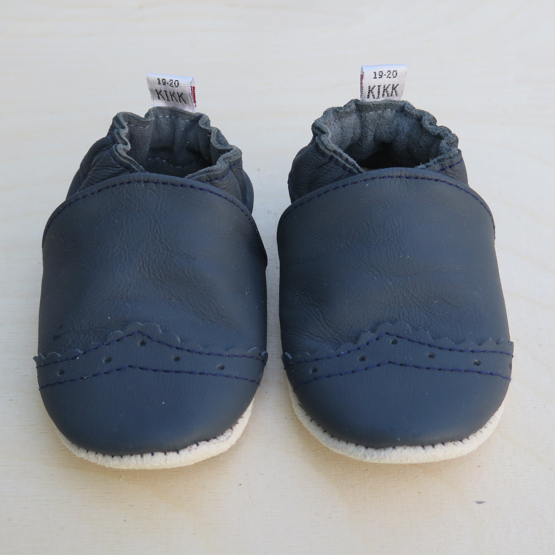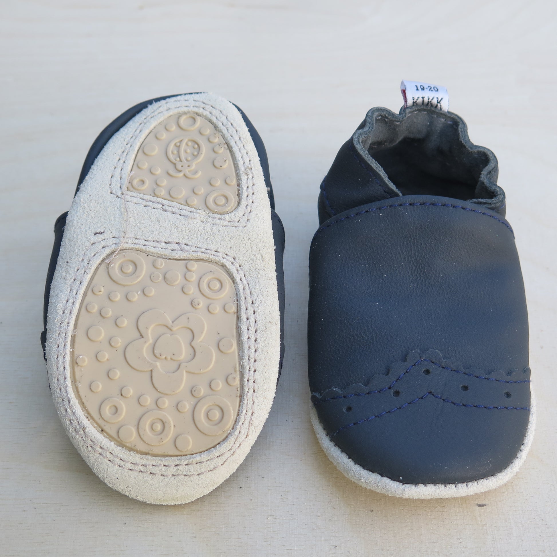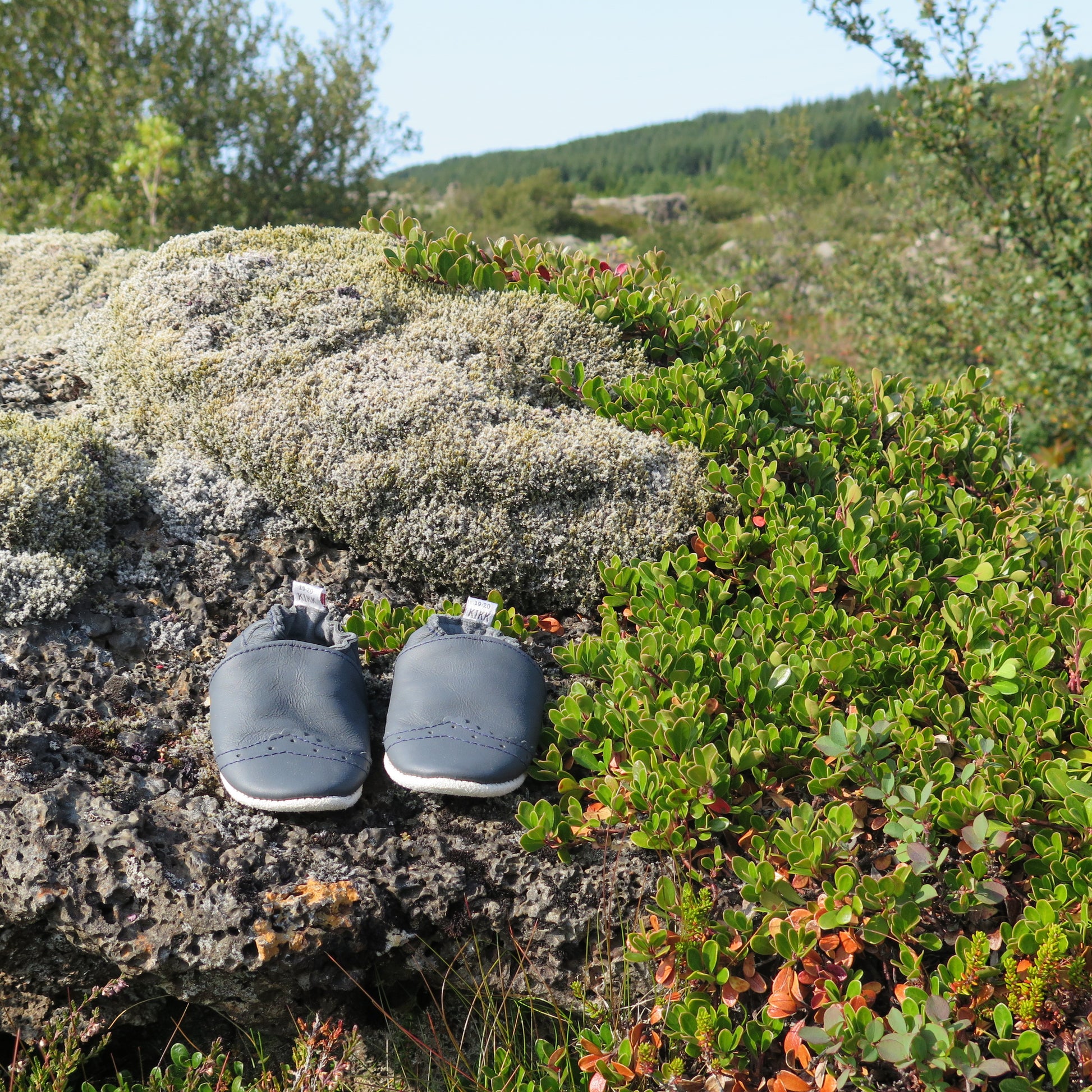 Leðurskór með gúmmí sóla. 6-12 mánaða – stærð 17-18 – 11,5 cm 9-18 mánaða – stærð 19-20 – 12,5 cm 1-2 ára – stærð 21-22 – 13,5 cm 1,5-3 ára – stærð 23-24 – 14,5 cm 2,5-4 ára – stærð 25-26 – 16,5 cm KIKK Reykjavík ungbarnaskórninr eru framleiddir úr mjúku geitaleðri. Þeir haldast vel á fæti og sólinn er stamur. Best er að hreinsa skóna með því að væta sólann og bursta rússkinnið varlega. Skóna má þrífa með blautri tusku.