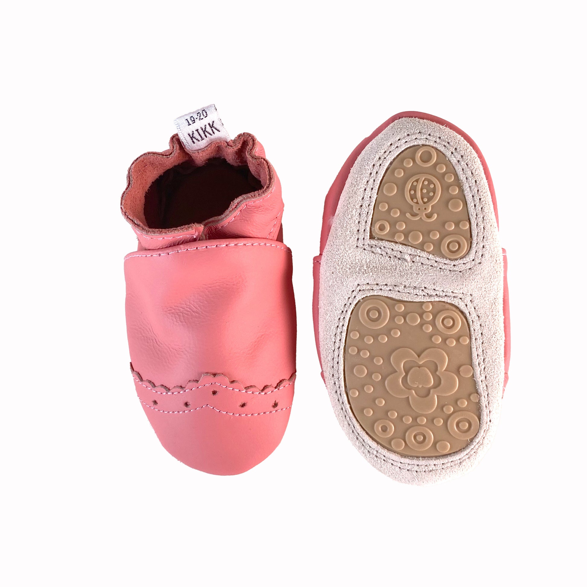 Leðurskór með gúmmí sóla. 6-12 mánaða – stærð 17-18 – 11,5 cm 9-18 mánaða – stærð 19-20 – 12,5 cm 1-2 ára – stærð 21-22 – 13,5 cm 1,5-3 ára – stærð 23-24 – 14,5 cm 2,5-4 ára – stærð 25-26 – 16,5 cm KIKK Reykjavík ungbarnaskórninr eru framleiddir úr mjúku geitaleðri. Þeir haldast vel á fæti og sólinn er stamur. Best er að hreinsa skóna með því að væta sólann og bursta rússkinnið varlega. Skóna má þrífa með blautri tusku.