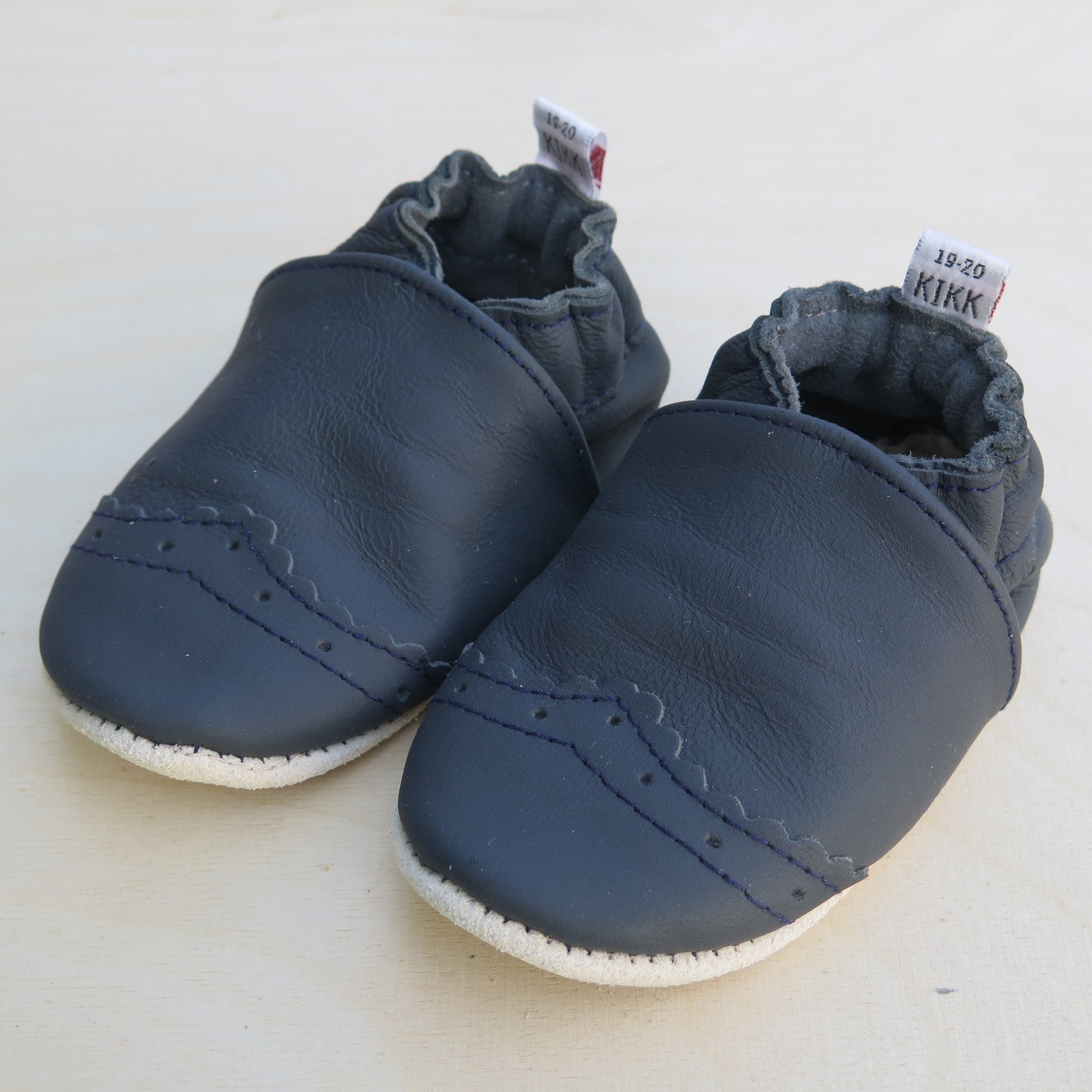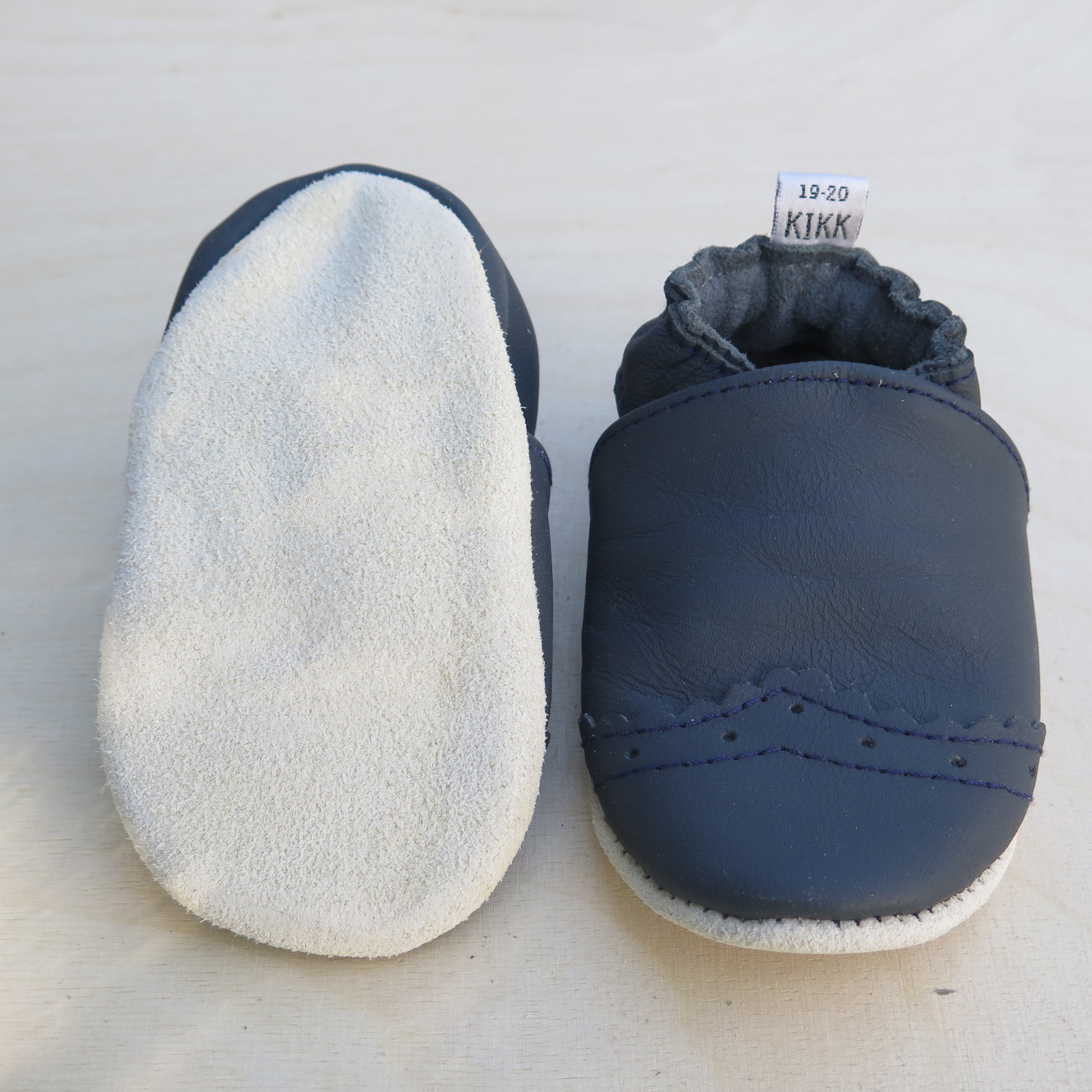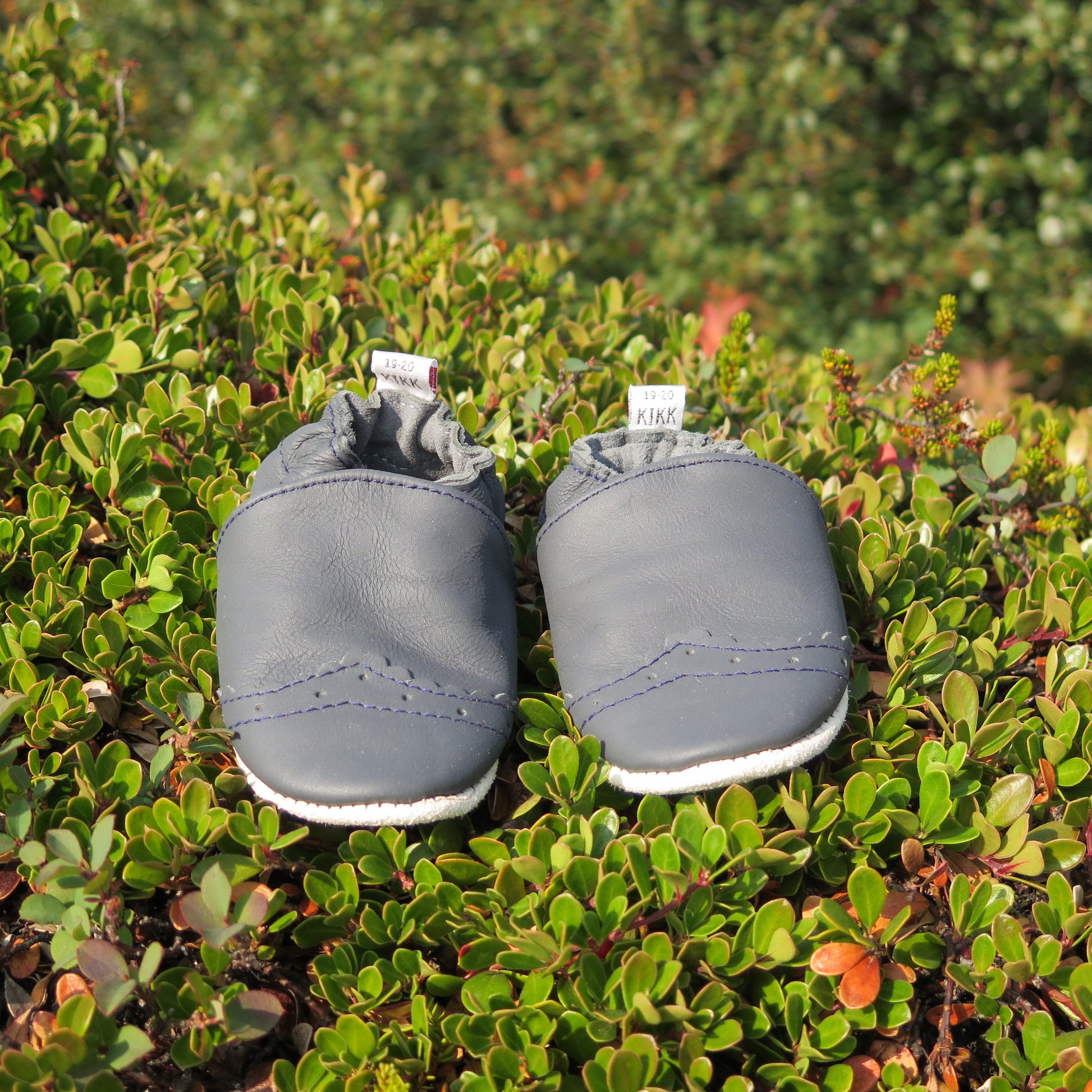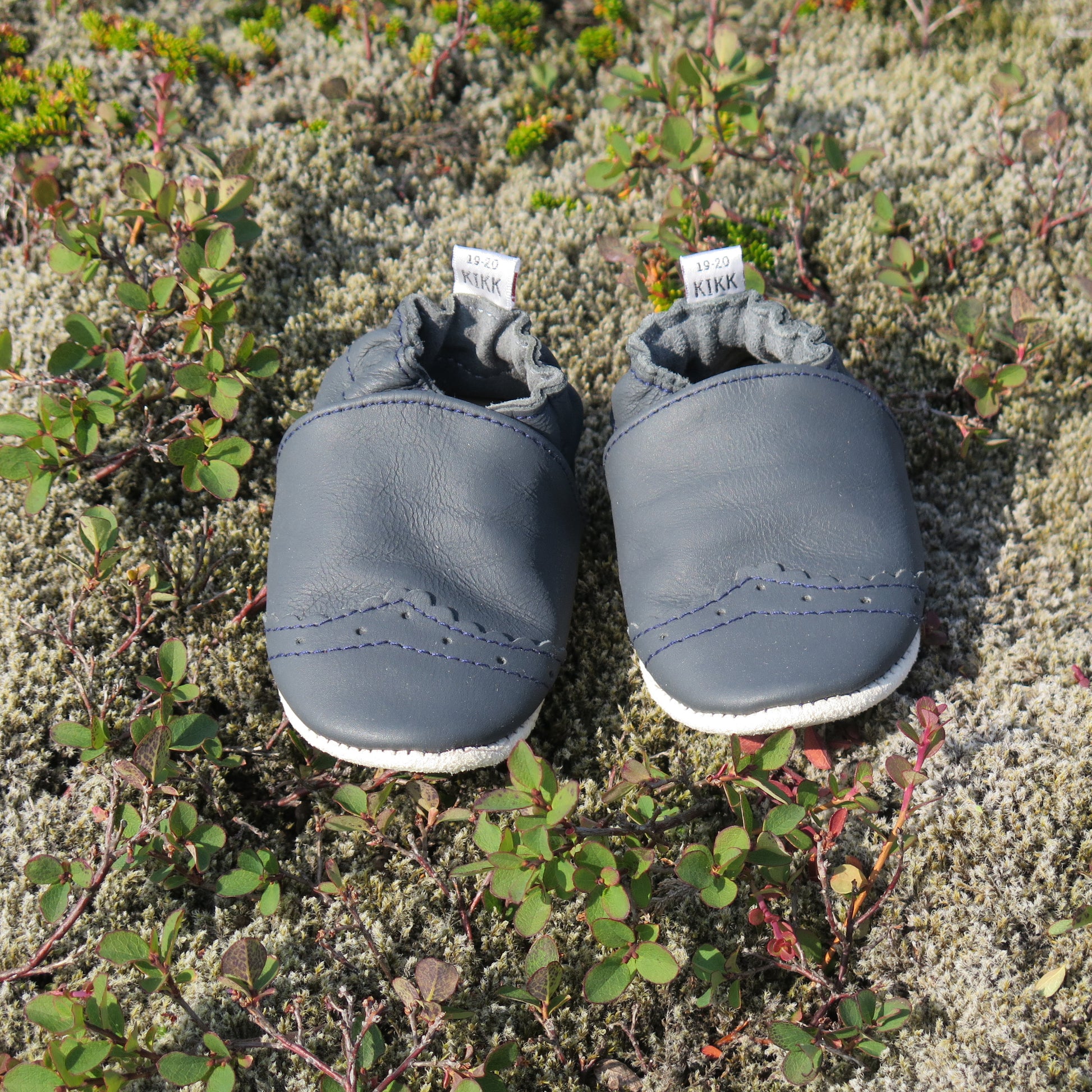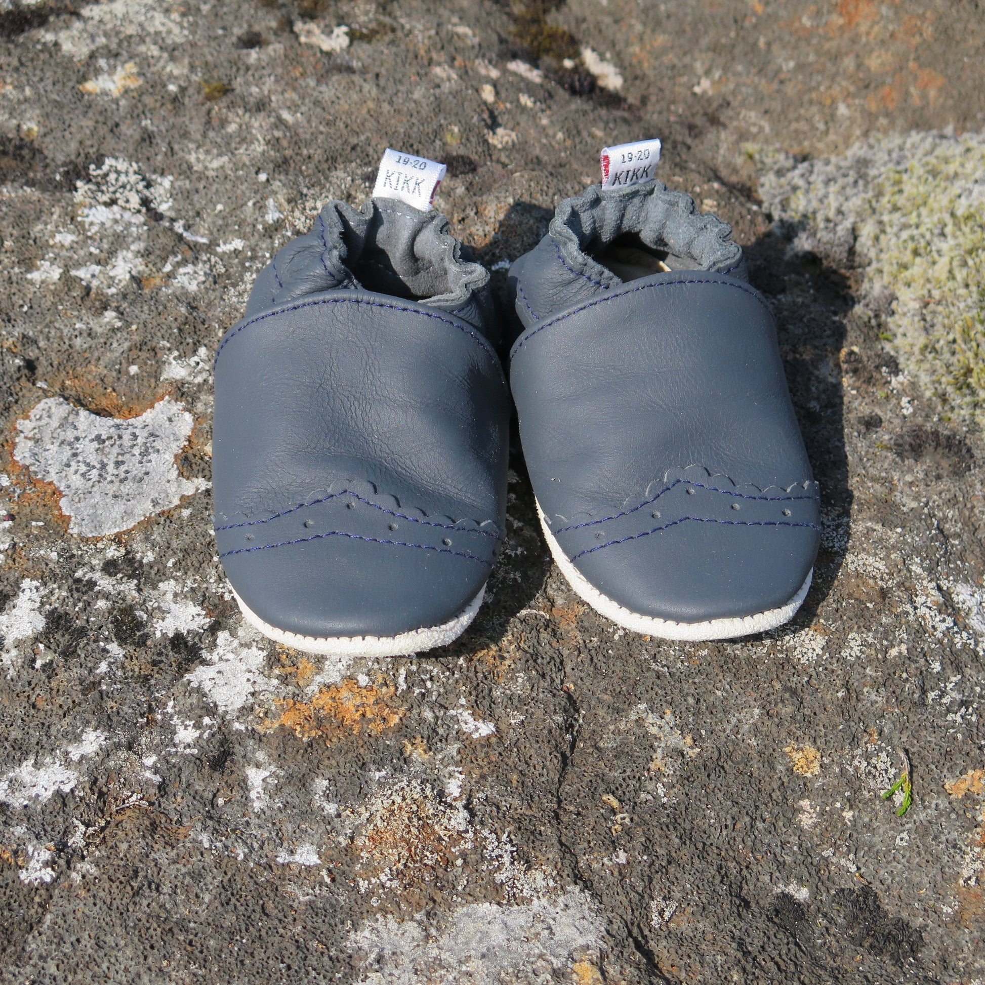 Leðurskór með mjúkum sóla. 3-9 mánaða – stærð 15-16 – 10,5 cm 6-12 mánaða – stærð 17-18 – 11,5 cm 9-18 mánaða – stærð 19-20 – 12,5 cm 1-2 ára – stærð 21-22 – 13,5 cm 1,5-3 ára – stærð 23-24 – 14,5 cm 2,5-4 ára – stærð 25-26 – 16,5 cm KIKK Reykjavík ungbarnaskórninr eru framleiddir úr mjúku geitaleðri. Þeir haldast vel á fæti og sólinn er stamur. Best er að hreinsa skóna með því að væta sólann og bursta rússkinnið varlega. Skóna má þrífa með blautri tusku.