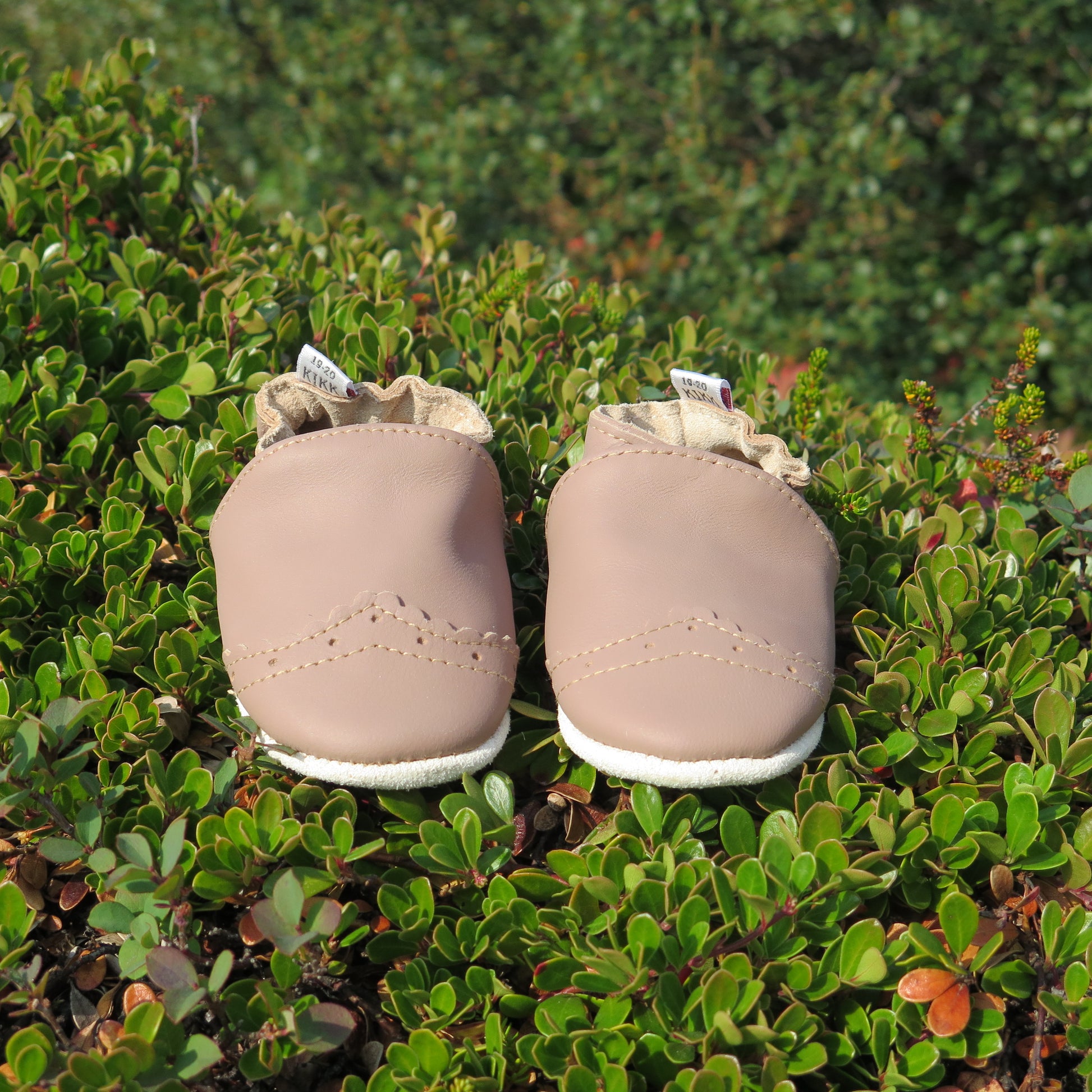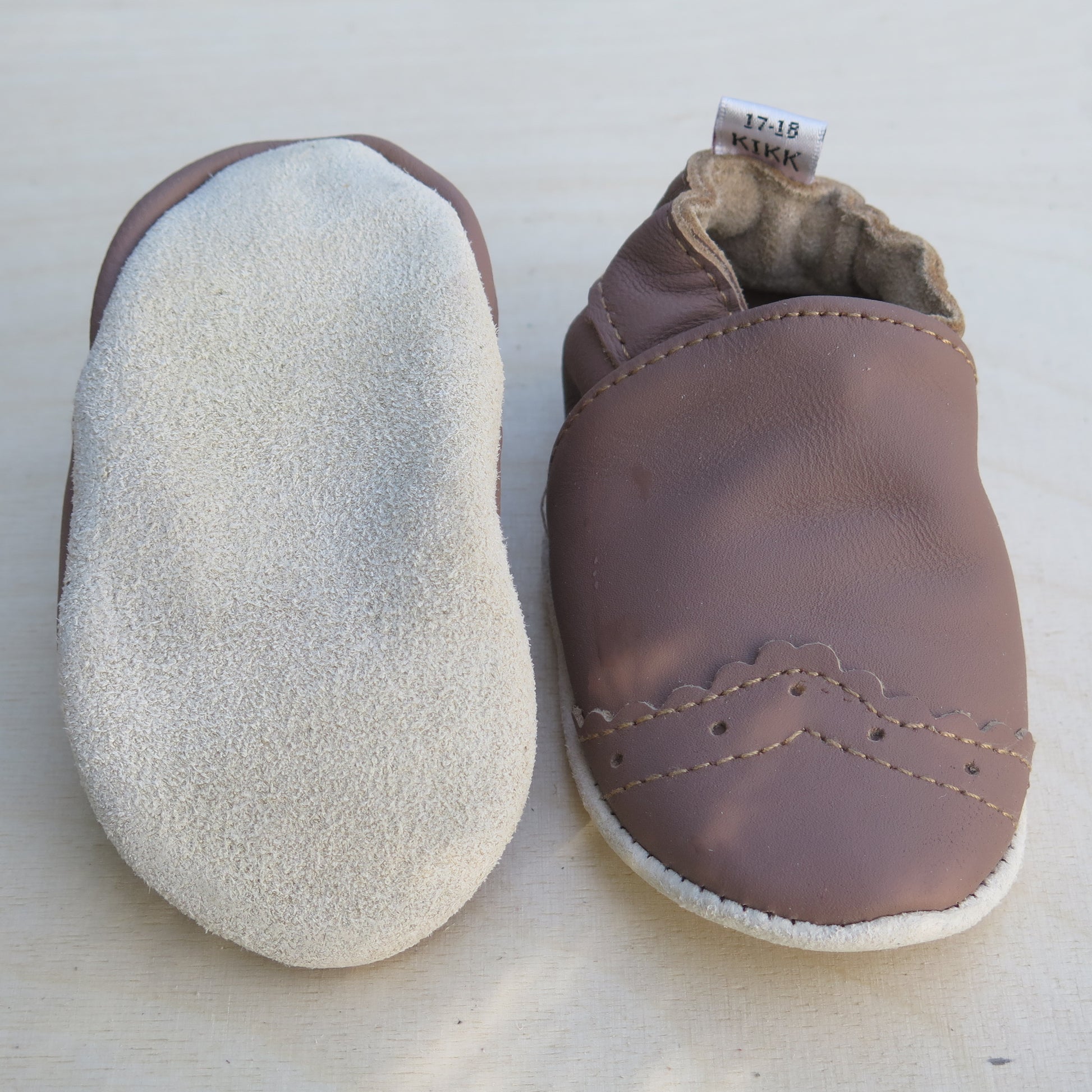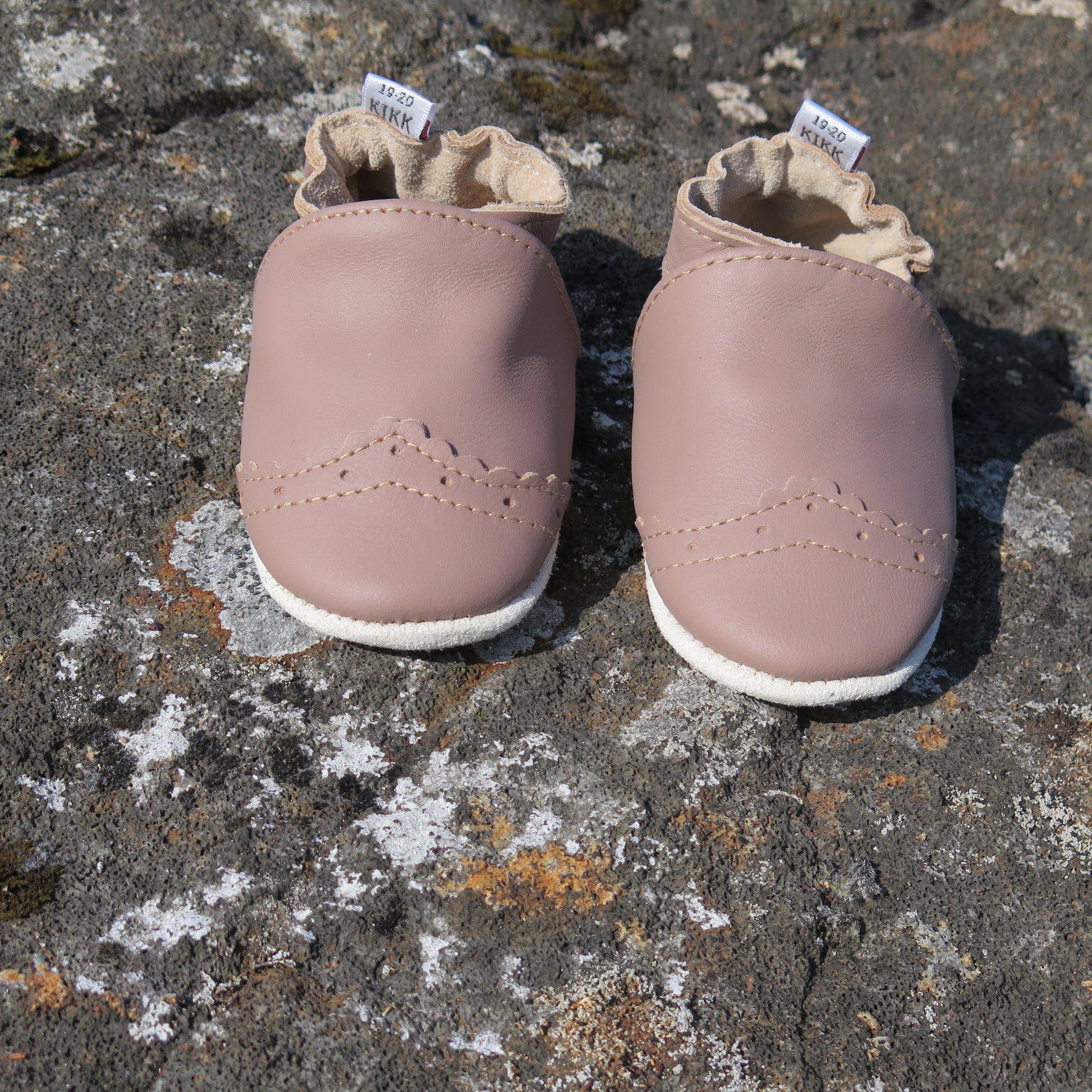 Leðurskór með mjúkum sóla. 3-9 mánaða – stærð 15-16 – 10,5 cm 6-12 mánaða – stærð 17-18 – 11,5 cm 9-18 mánaða – stærð 19-20 – 12,5 cm 1-2 ára – stærð 21-22 – 13,5 cm 1,5-3 ára – stærð 23-24 – 14,5 cm 2,5-4 ára – stærð 25-26 – 16,5 cm KIKK Reykjavík ungbarnaskórninr eru framleiddir úr mjúku geitaleðri. Þeir haldast vel á fæti og sólinn er stamur. Best er að hreinsa skóna með því að væta sólann og bursta rússkinnið varlega. Skóna má þrífa með blautri tusku.
